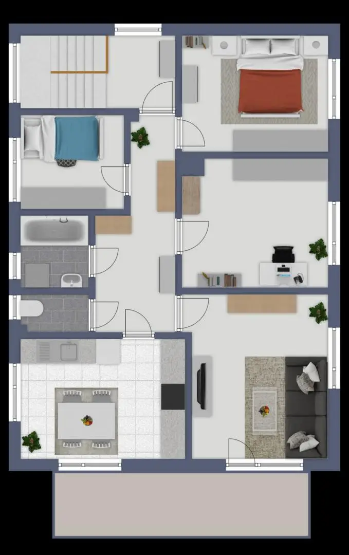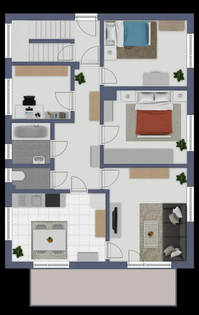 Jeweils zwei Schlafzimmer, ein Wohnzimmer, eine Küche sowie ein separates WC, ein Badezimmer und ein Büro.