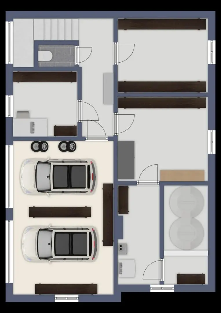 Im Kellergeschoss befinden sich zwei Abstellräume, eine Werkstatt, ein WC sowie der Heizraum. Vom Vorraum gelangen Sie direkt in die Doppelgarage.