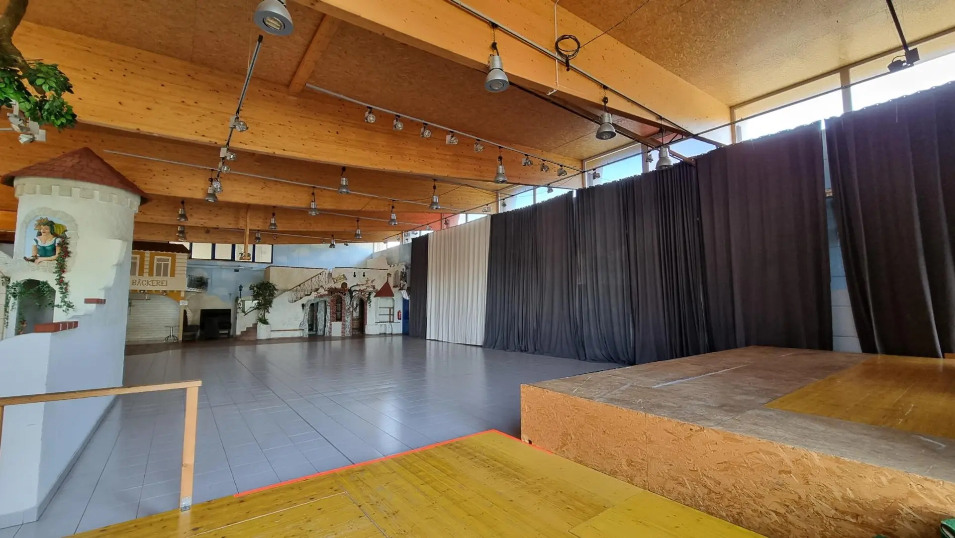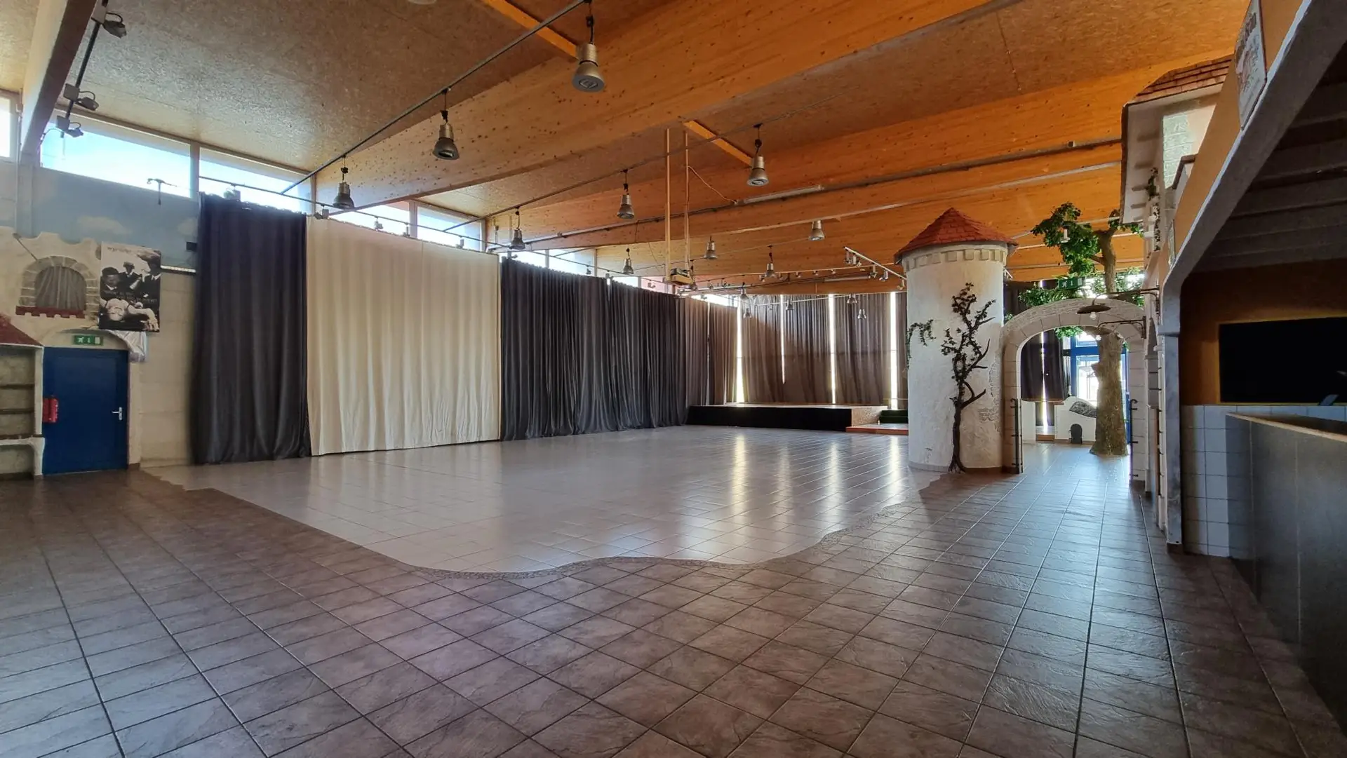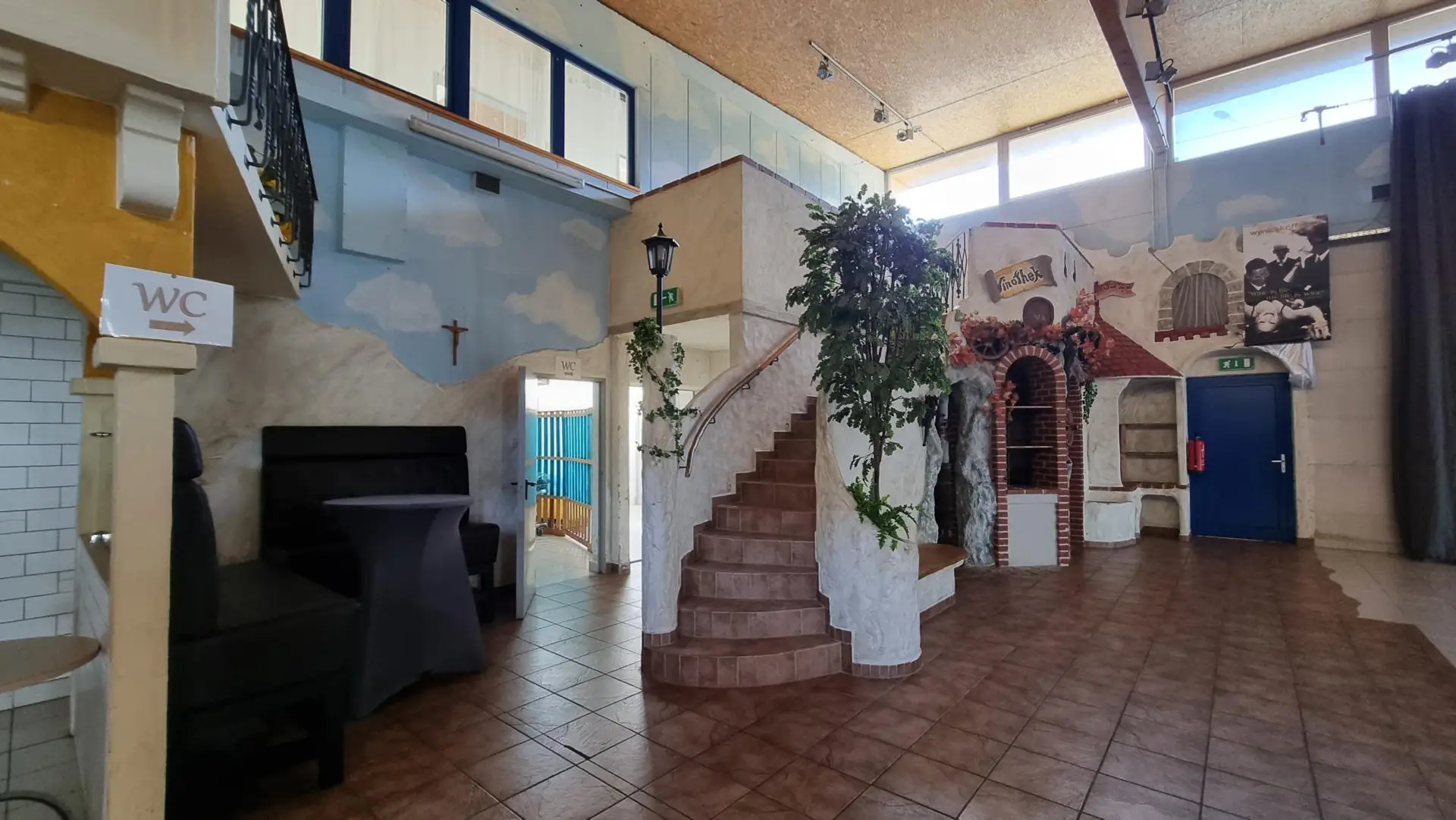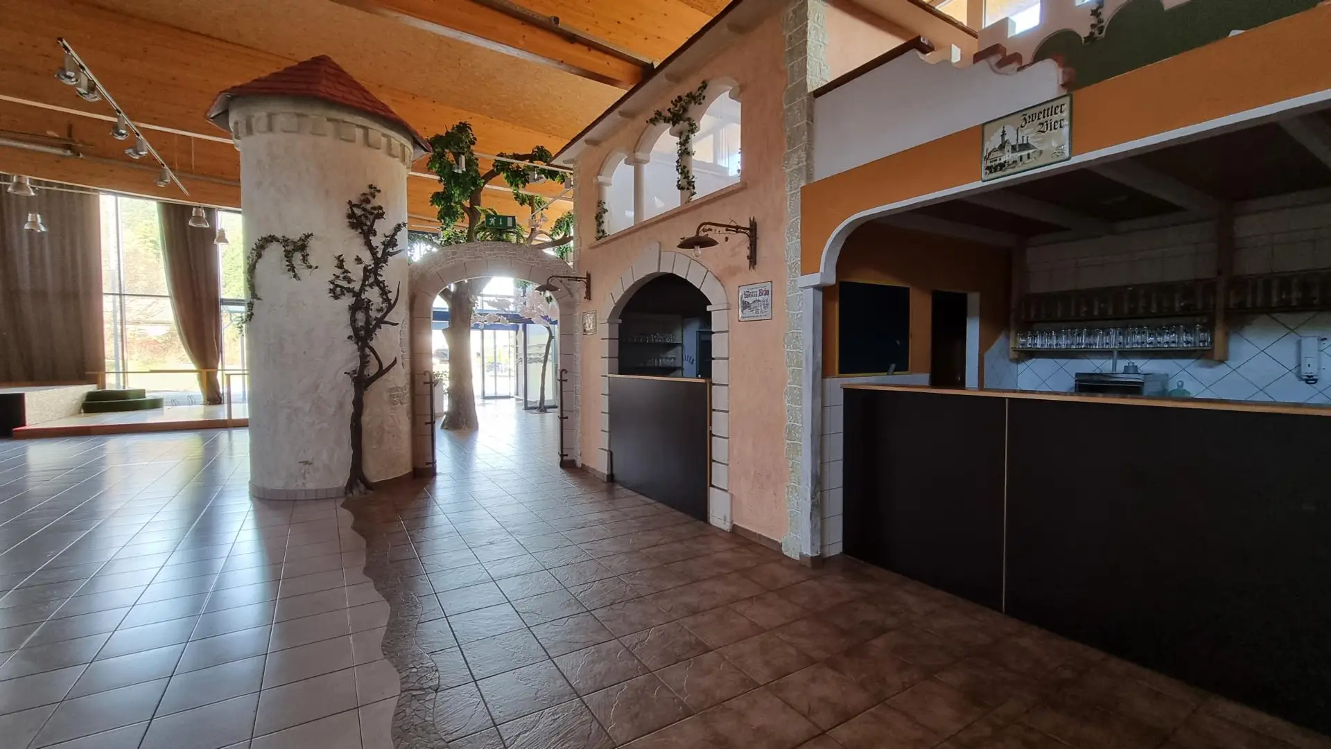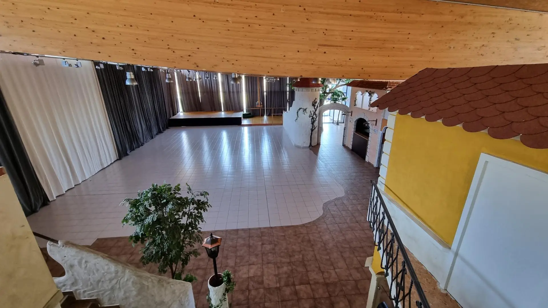 Der Eingangsbereich führt durch einen hell gestalteten Windfang, der als praktische Garderobe genutzt wird, direkt in die geräumige Veranstaltungshalle. Diese ist im Stil eines rustikalen, atmosphärischen Marktplatzes gestaltet und umfasst dekorative Steinhauselemente, die als einladende Bar- und Restaurantbereiche dienen. Eine gut sichtbare Bühne befindet sich beim Eingangsbereich vor einer großen, lichtdurchfluteten Fensterfront, während die übrigen Wandflächen mit Vorhängen verkleidet sind. Hinter der Halle liegt eine funktionale, gut ausgestattete Betriebsküche mit Anrichtebereich sowie ein Lager mit separatem Kühlraum und direkter Anlieferungszone. Im Erdgeschoss steht zudem ein eigenes Mitarbeiter-WC zur Verfügung.