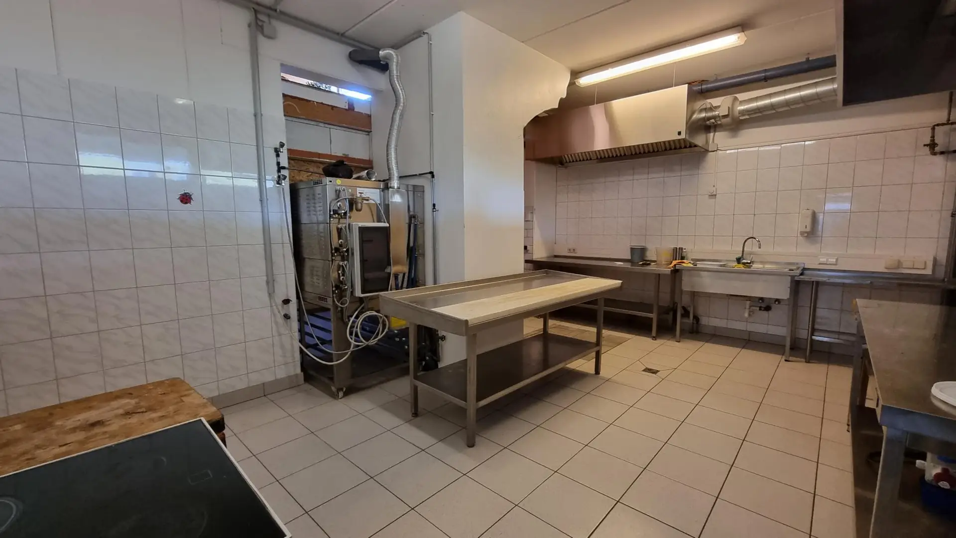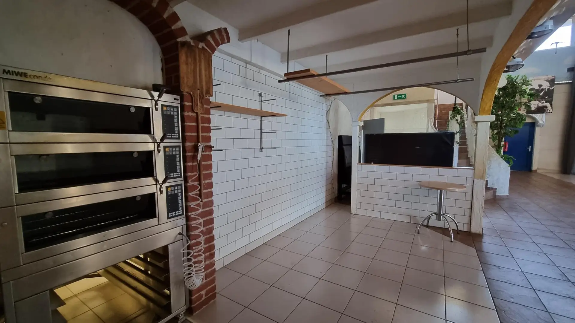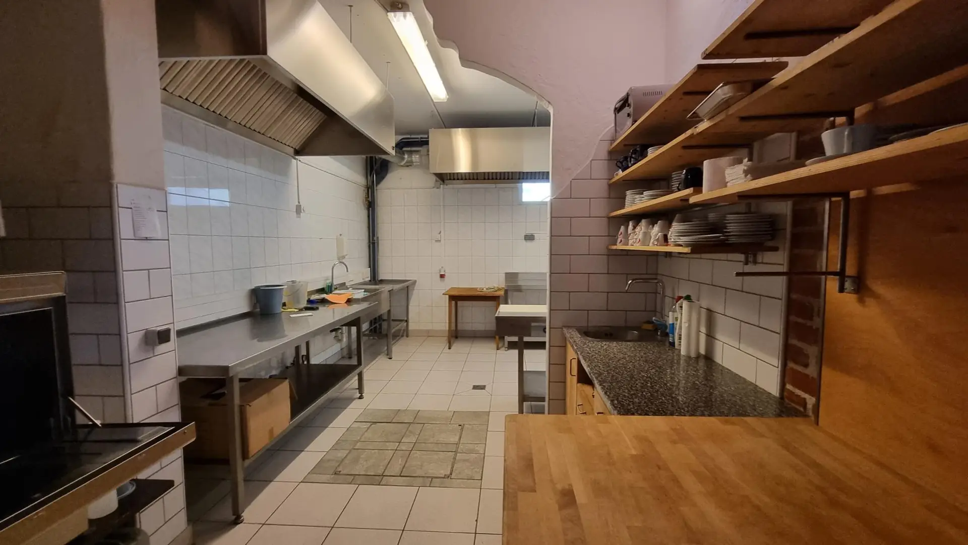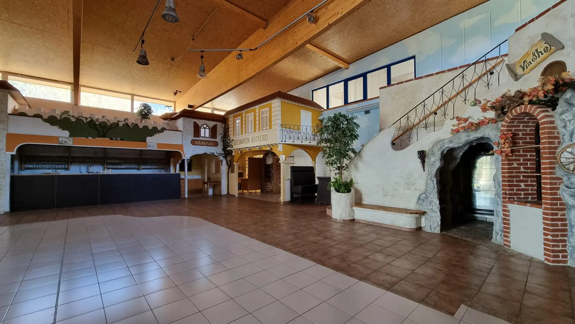 Der Eingangsbereich führt durch einen hell gestalteten Windfang, der als praktische Garderobe genutzt wird, direkt in die geräumige Veranstaltungshalle. Diese ist im Stil eines rustikalen, atmosphärischen Marktplatzes gestaltet und umfasst dekorative Steinhauselemente, die als einladende Bar- und Restaurantbereiche dienen. Eine gut sichtbare Bühne befindet sich beim Eingangsbereich vor einer großen, lichtdurchfluteten Fensterfront, während die übrigen Wandflächen mit Vorhängen verkleidet sind. Hinter der Halle liegt eine funktionale, gut ausgestattete Betriebsküche mit Anrichtebereich sowie ein Lager mit separatem Kühlraum und direkter Anlieferungszone. Im Erdgeschoss steht zudem ein eigenes Mitarbeiter-WC zur Verfügung.