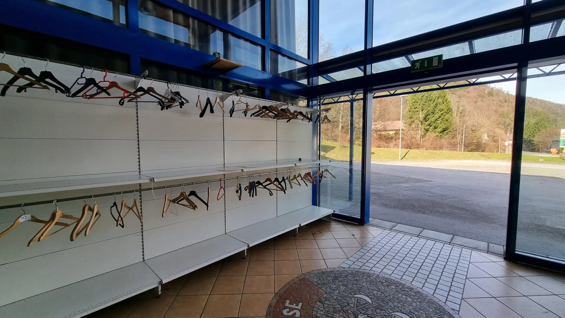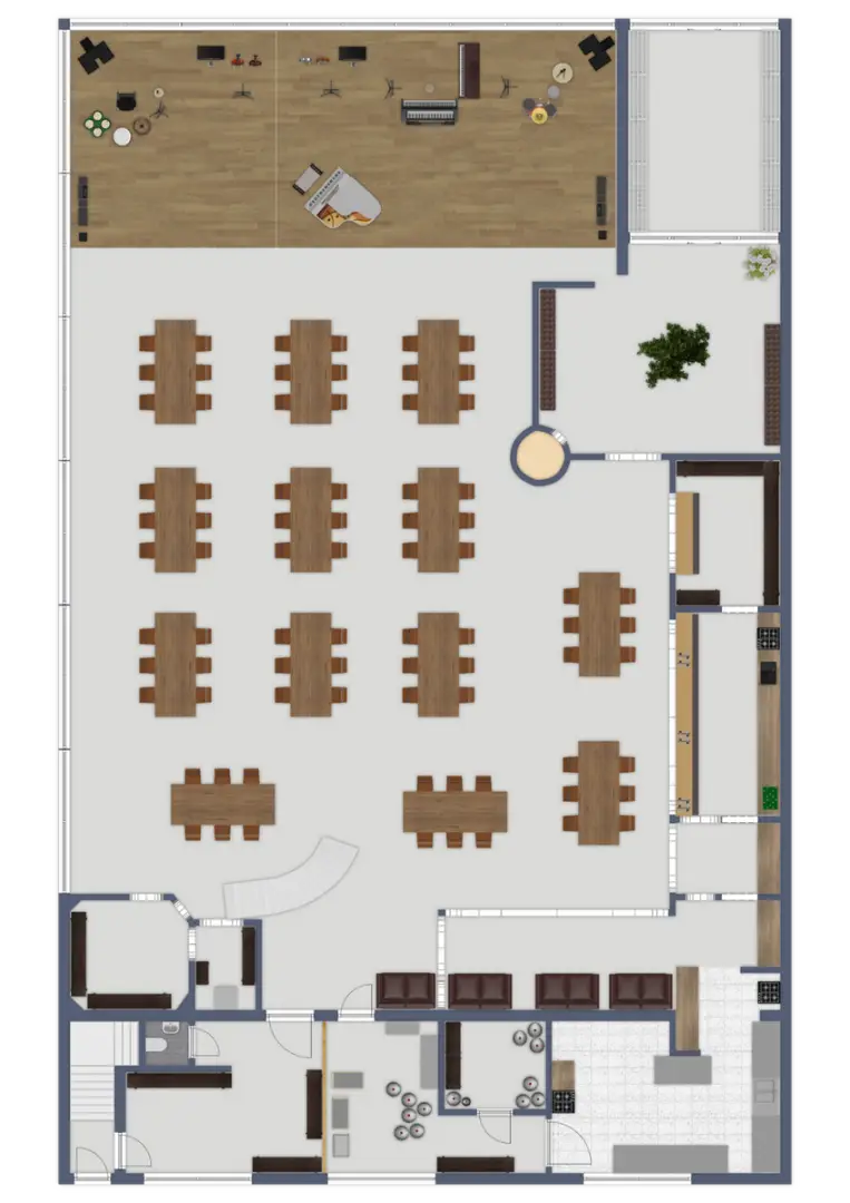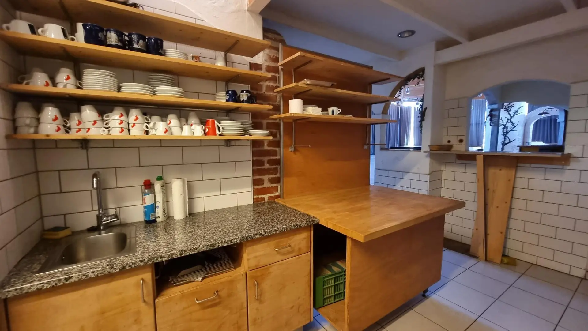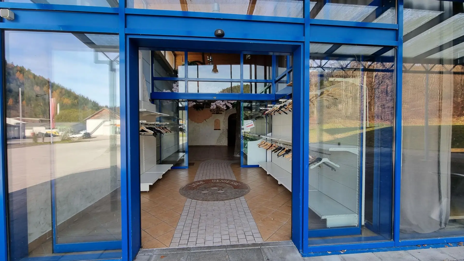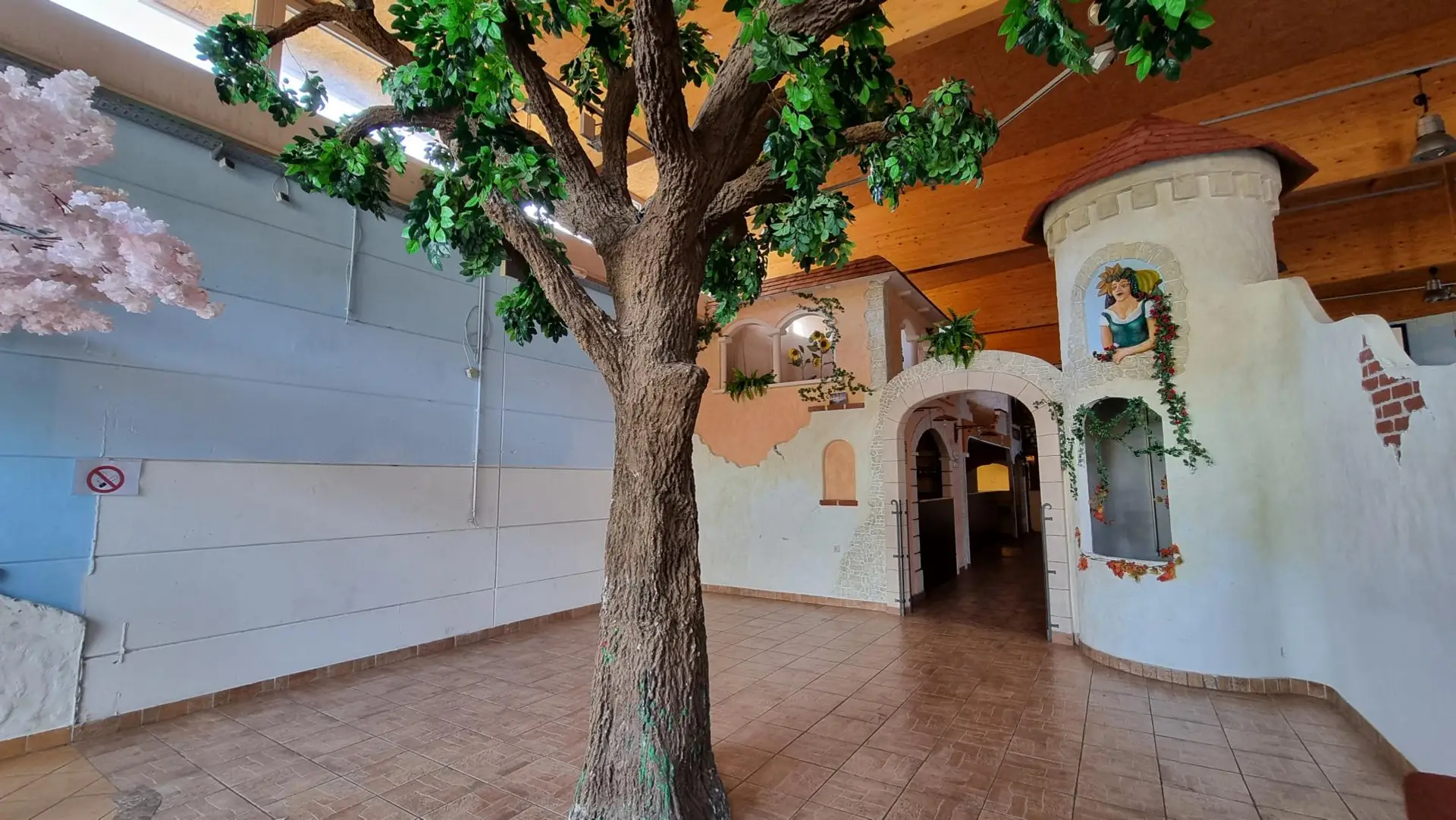 Der Eingangsbereich führt durch einen hell gestalteten Windfang, der als praktische Garderobe genutzt wird, direkt in die geräumige Veranstaltungshalle. Diese ist im Stil eines rustikalen, atmosphärischen Marktplatzes gestaltet und umfasst dekorative Steinhauselemente, die als einladende Bar- und Restaurantbereiche dienen. Eine gut sichtbare Bühne befindet sich beim Eingangsbereich vor einer großen, lichtdurchfluteten Fensterfront, während die übrigen Wandflächen mit Vorhängen verkleidet sind. Hinter der Halle liegt eine funktionale, gut ausgestattete Betriebsküche mit Anrichtebereich sowie ein Lager mit separatem Kühlraum und direkter Anlieferungszone. Im Erdgeschoss steht zudem ein eigenes Mitarbeiter-WC zur Verfügung.