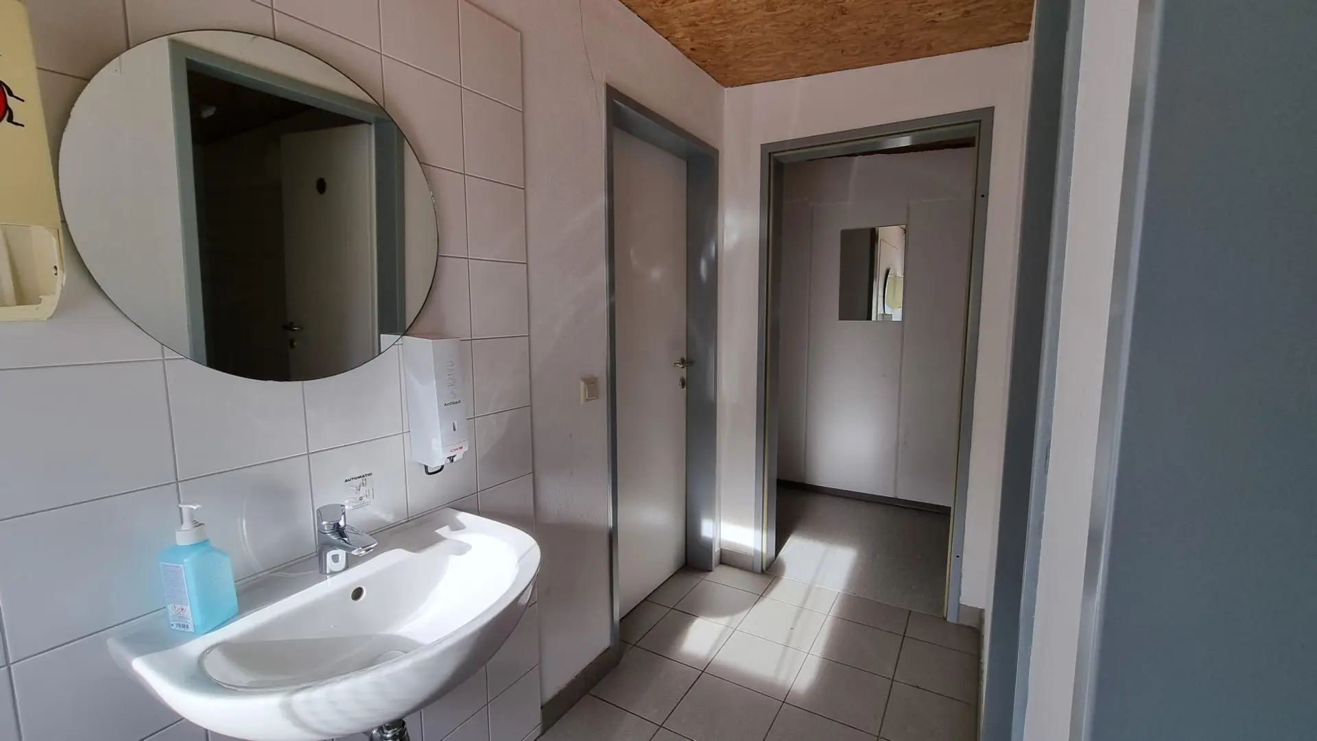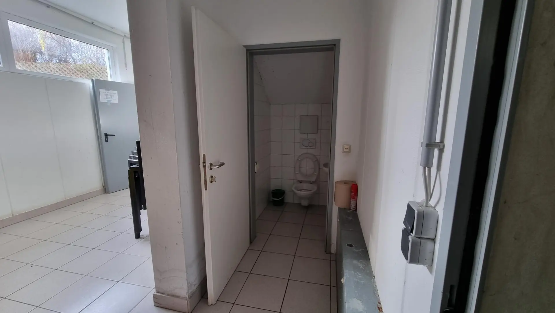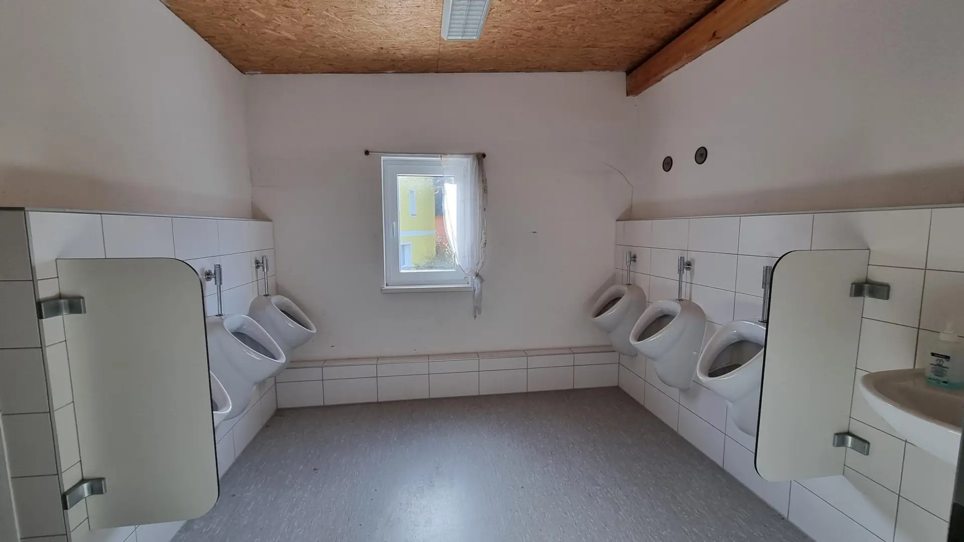Im Obergeschoss gelangt man zu einem Büro, einem gepflegter Sanitärbereich mit Damen/Herren-WCs und Pissoirs, sowie einem Technikraum. Ein separater Angestelltenzugang am hinteren Gebäudeteil führt ebenfalls direkt in das Obergeschoss. Ergänzend bietet das Grundstück einen angebauten, geräumigen Bereich für Leergut und Müll.