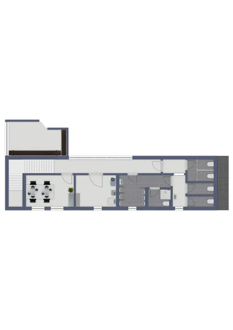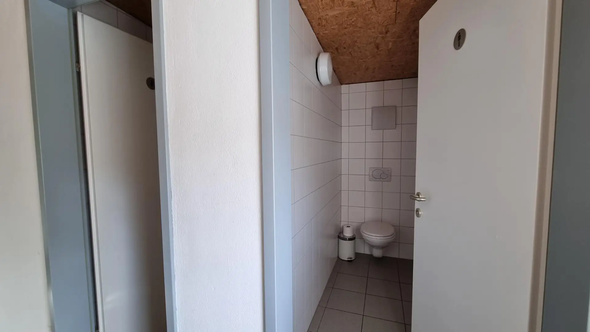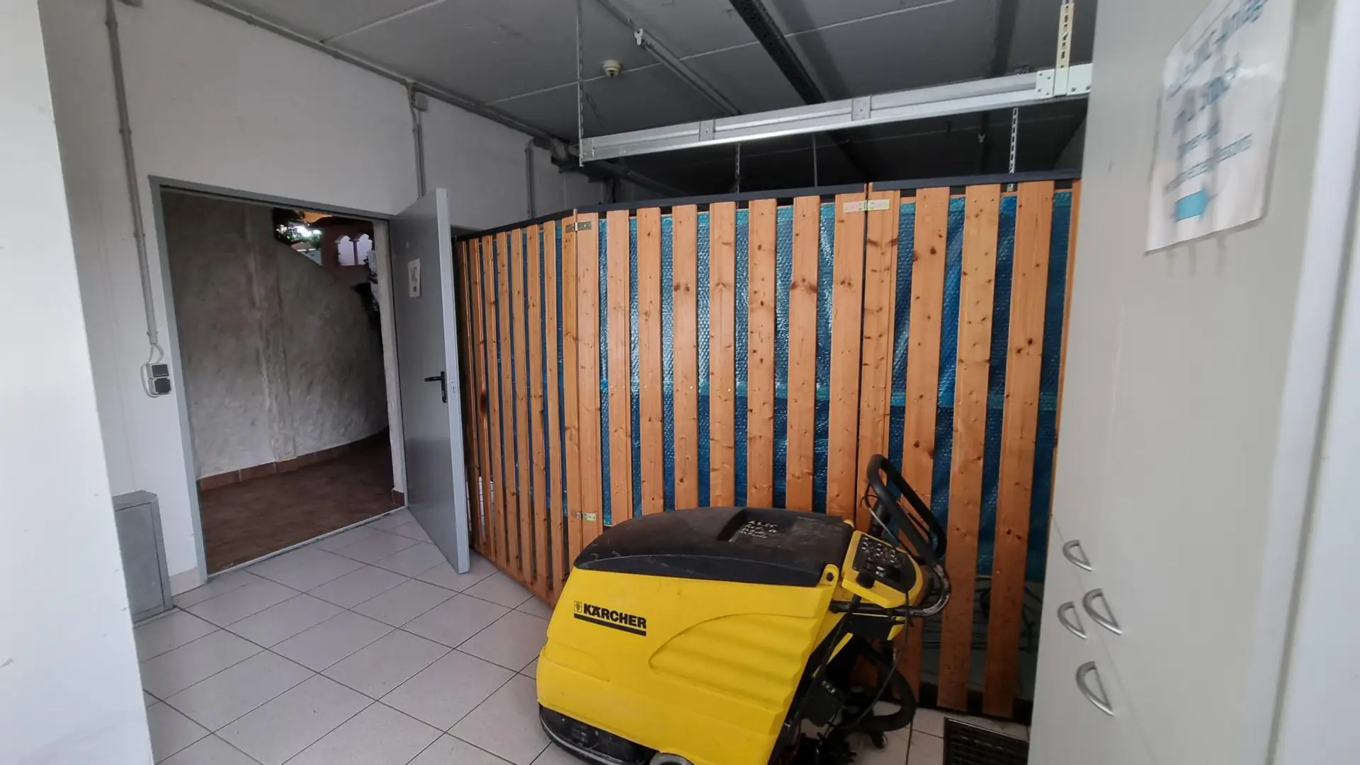 Im Obergeschoss gelangt man zu einem Büro, einem gepflegter Sanitärbereich mit Damen/Herren-WCs und Pissoirs, sowie einem Technikraum. Ein separater Angestelltenzugang am hinteren Gebäudeteil führt ebenfalls direkt in das Obergeschoss. Ergänzend bietet das Grundstück einen angebauten, geräumigen Bereich für Leergut und Müll.