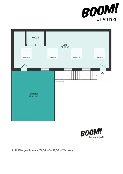 Loft: ca. 109,20 m² (EG) + 72,24 m² (1. OG) + 38,30 m² Terrasse
