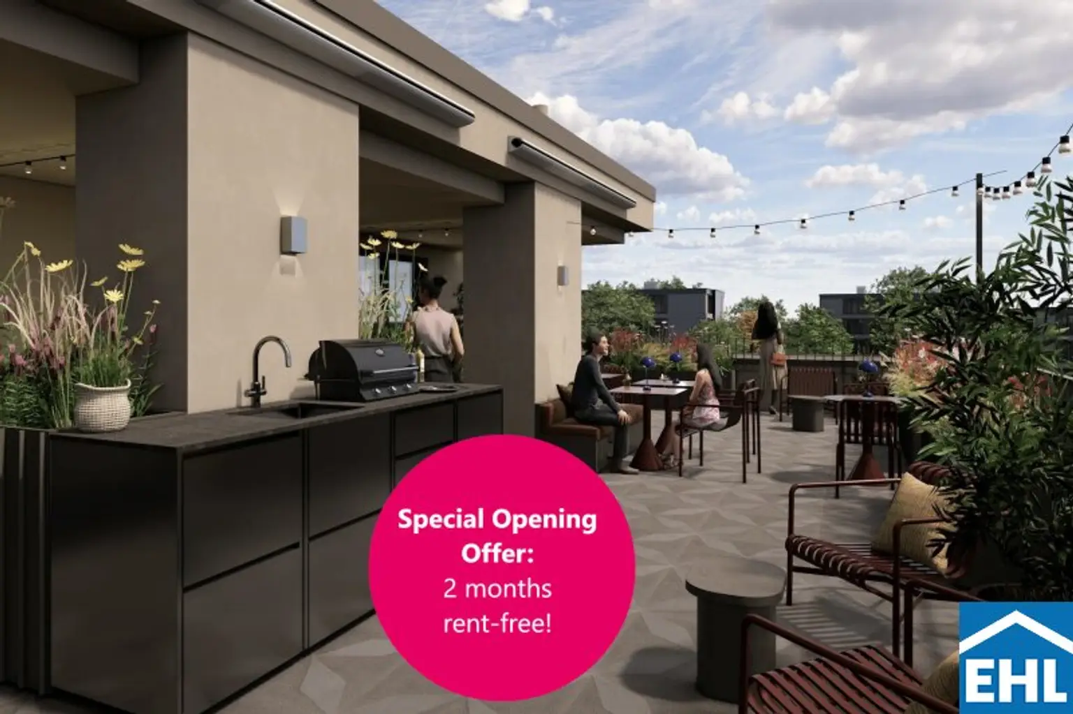 Neben Ihrem privaten Wohnbereich profitieren Sie von großzügigen, hochwertig gestalteten Gemeinschaftsflächen, die weit über das Übliche hinausgehen: Ob konzentriertes Arbeiten im Co-Working Space, entspannte Stunden in der stilvollen Bewohner Lounge oder aktive Pausen im hauseigenen Fitness- und Yogastudio – hier finden Sie genau den Ort, den Sie gerade brauchen. Für gesellige Momente stehen Ihnen ein exklusiver Private-Dining-Raum, ein Gaming Room und ein einladender Kinosaal zur Verfügung. Wer kreativ tätig werden möchte, findet im professionell ausgestatteten Podcast Raum den idealen Rahmen. Ein besonderes Highlight ist die grüne Dachterrasse mit Gemeinschaftsgarten – ein Rückzugsort über den Dächern der Stadt, der zum Entspannen, Gärtnern und Genießen einlädt.