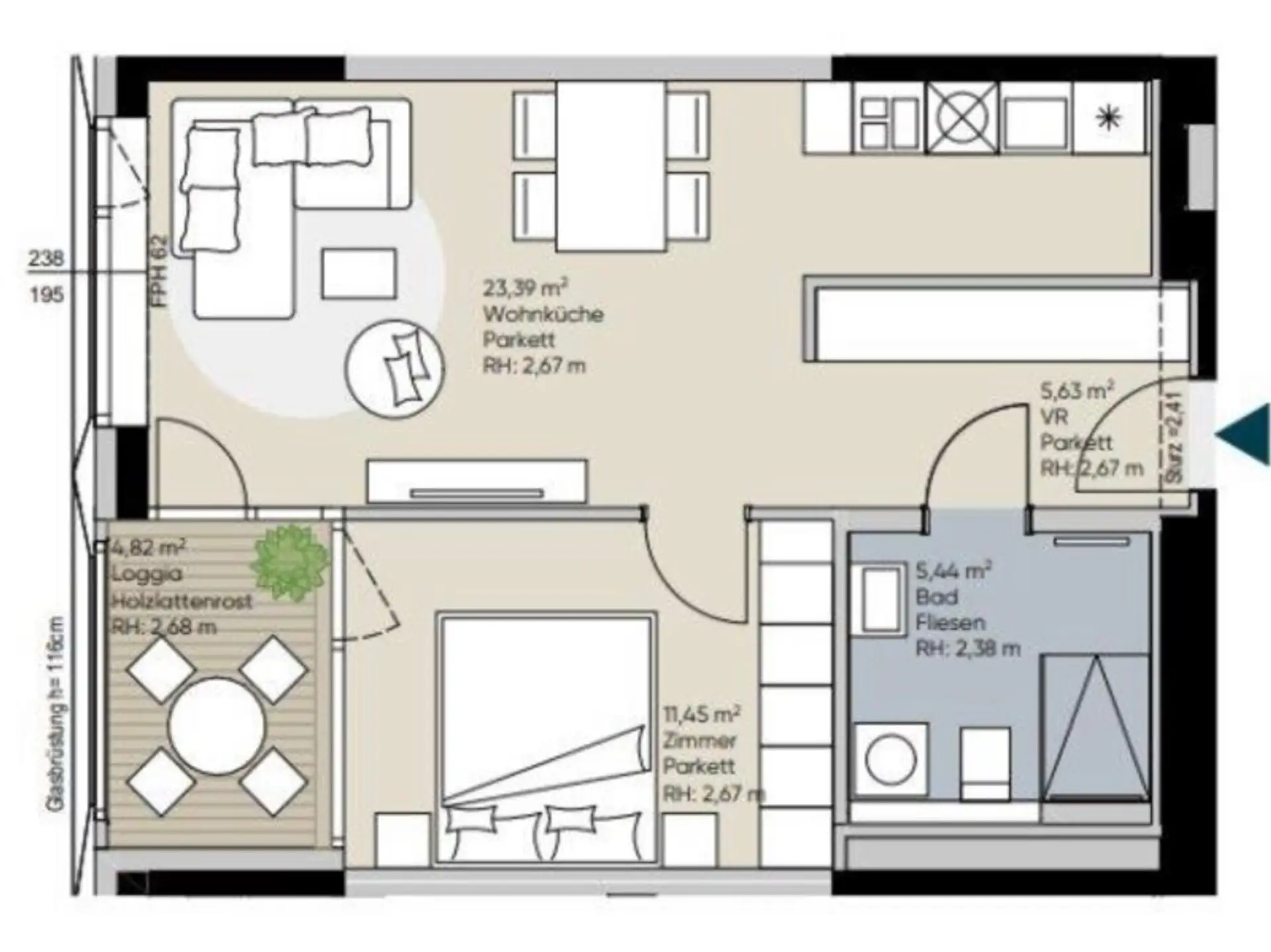 Diese helle, charmante Wohnung besticht durch ihre clever geschnittene Räume. Gleich beim Eingang bietet eine große Nische Platz für einen Einbauschrank mit viel Stauraum. Durch die Abtrennung der Küche vom Vorzimmer und Wohnzimmer bleibt der Wohn-Essbereich offen und großzügig, ohne auf Komfort zu verzichten. Der lichtdurchflutete Wohnraum mit französischen Fenstern eröffnet einen weiten Blick über die Dächer Wiens und führt direkt auf die Loggia – perfekt für entspannte Stunden im Freien. Das Schlafzimmer (ca. 11,5 m²) bietet ausreichend Platz für Bett und Schrank. Das Bad mit Dusche, WC und Waschbecken liegt praktisch neben dem Schlafzimmer.