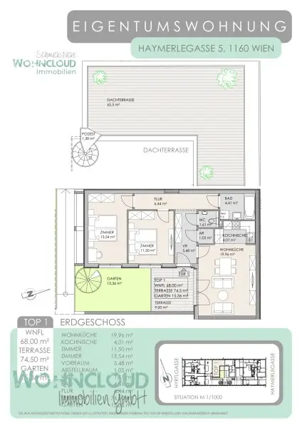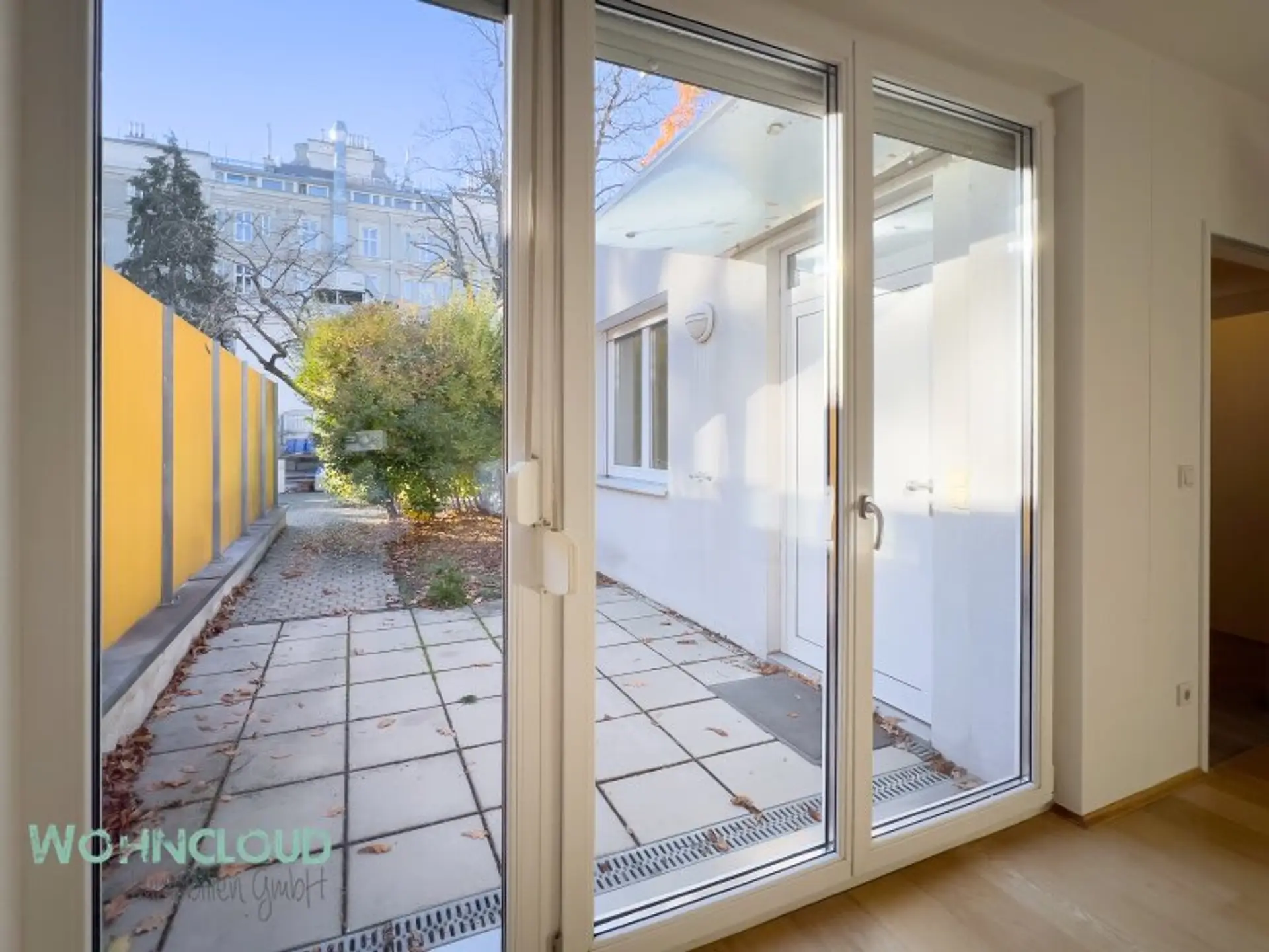 Ihr hübscher Bungalow – Top 1 – liegt völlig geschützt zwischen den beiden Wohnhäusern in der Haymerlegasse und der Hyrtlgasse, gleich neben der in Wien bekannten Schmelz.