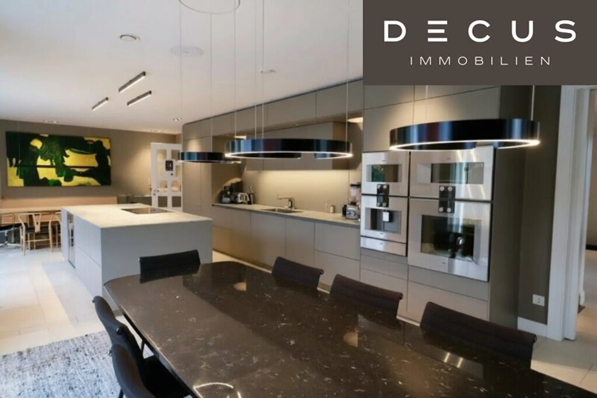 Über dem Essbereich inszenieren höhenverstellbare, touch-dimmbare Occhio-Leuchten das Licht mit beeindruckender Präzision. DRAP-Leuchten ergänzen das durchdachte Lichtkonzept und schaffen je nach Tageszeit eine warme, intime oder repräsentative Atmosphäre.