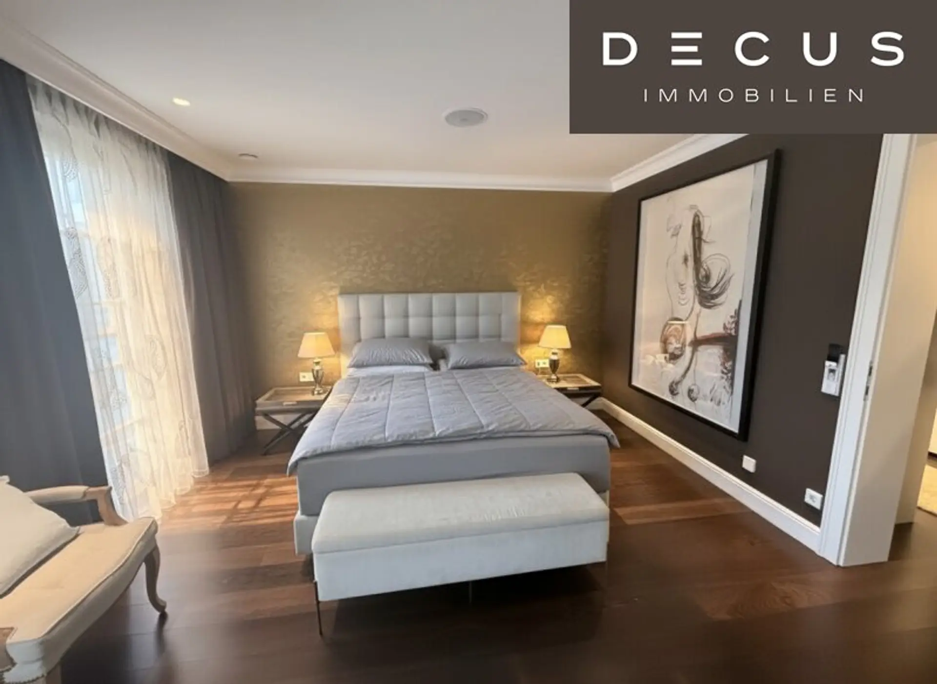 Der diskret situierte Masterbereich im Erdgeschoss umfasst ein Schlafzimmer, ein elegantes, helles Bad sowie einen großzügigen Schrankraum. Maßgefertigte Garderoben- und Schranksysteme bieten durchdachten Stauraum.