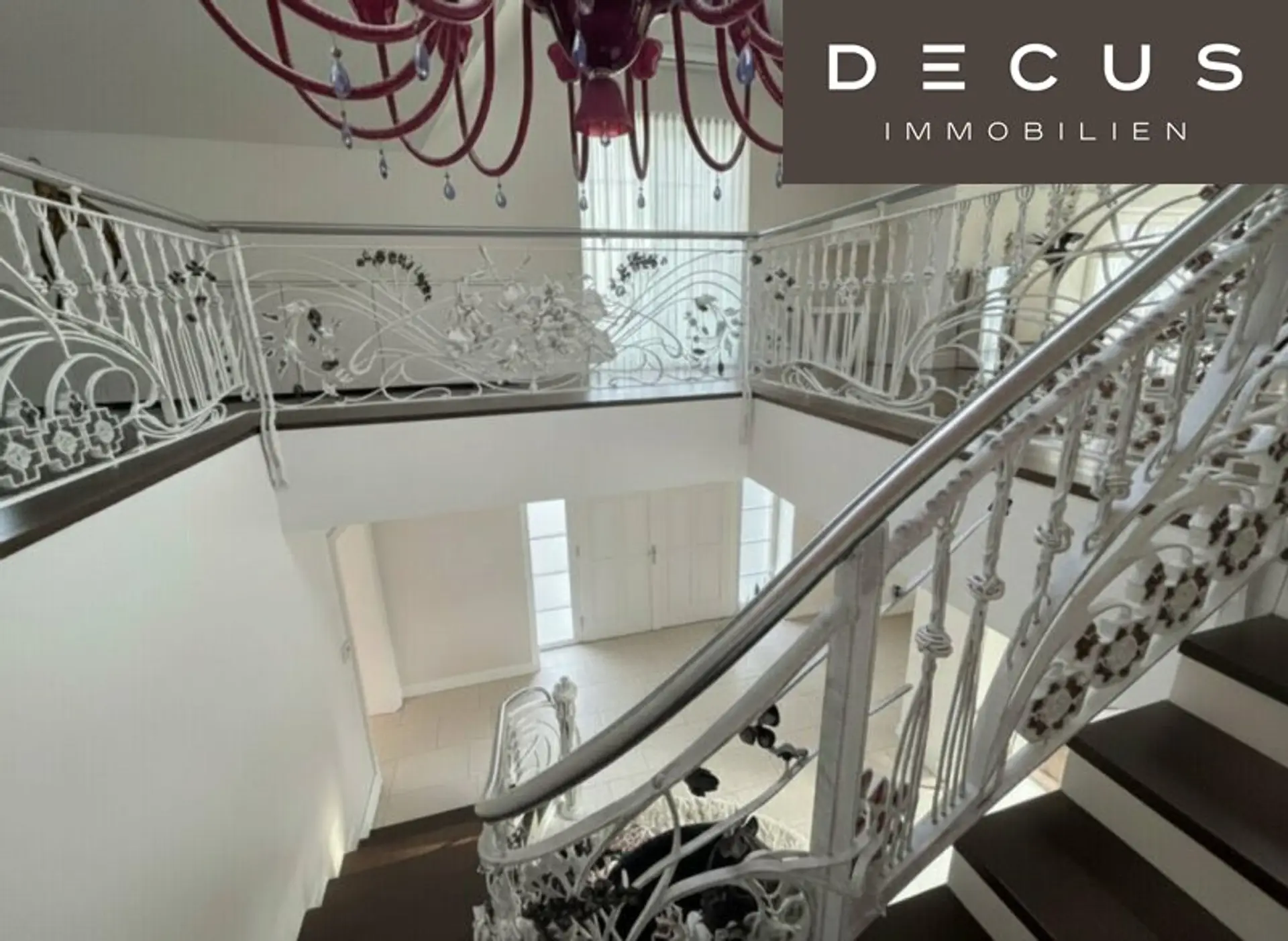 Bereits die Vorhalle des Hauses zeugt von der imposanten und repräsentativen Ausstattung des Hauses. Ein blumig geschwungenes gemaltes Schmiedeeisen-Stiegengeländer - verziert mit hochwertigen bunten Murano-Steinen - und einer von drei riesigen, roten Murano-Lustern dominieren den ersten Eindruck.
