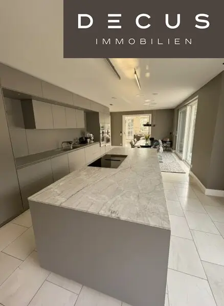 Offen in den Wohnbereich und mit großen Schiebetüren in den Garten, integriert und dennoch architektonisch klar definiert, präsentiert sich die beeindruckende Bulthaup-Küche wie ein Designobjekt im Raum – reduziert, hochwertig und zeitlos. Großzügige Arbeitsflächen, perfekte Proportionen und eine elegante Linienführung machen sie zum Treffpunkt für Familie und Gäste.