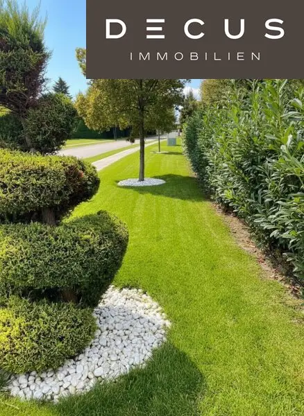 Neben den großzügigen Terrassen vor dem Wohnraum und der Küche verfügt die Villa über große, ebene Grünflächen im privaten Gartenbereich und im Vorgarten. Durch die automatische Bewässerung wird die Pflege erleichtert. Eine Außen- und Gartenbeleuchtung von DRAB setzen abends stimmungsvolle Akzente.