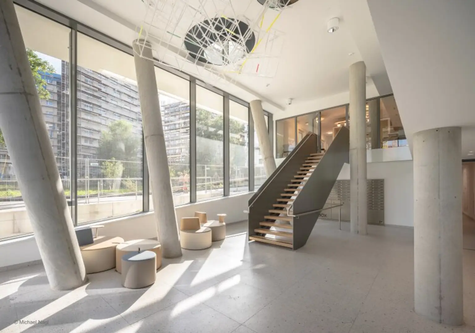 * zweigeschossiges Foyer mit Lichtinstallation des österreichischen Künstlers Friedrich Biedermann