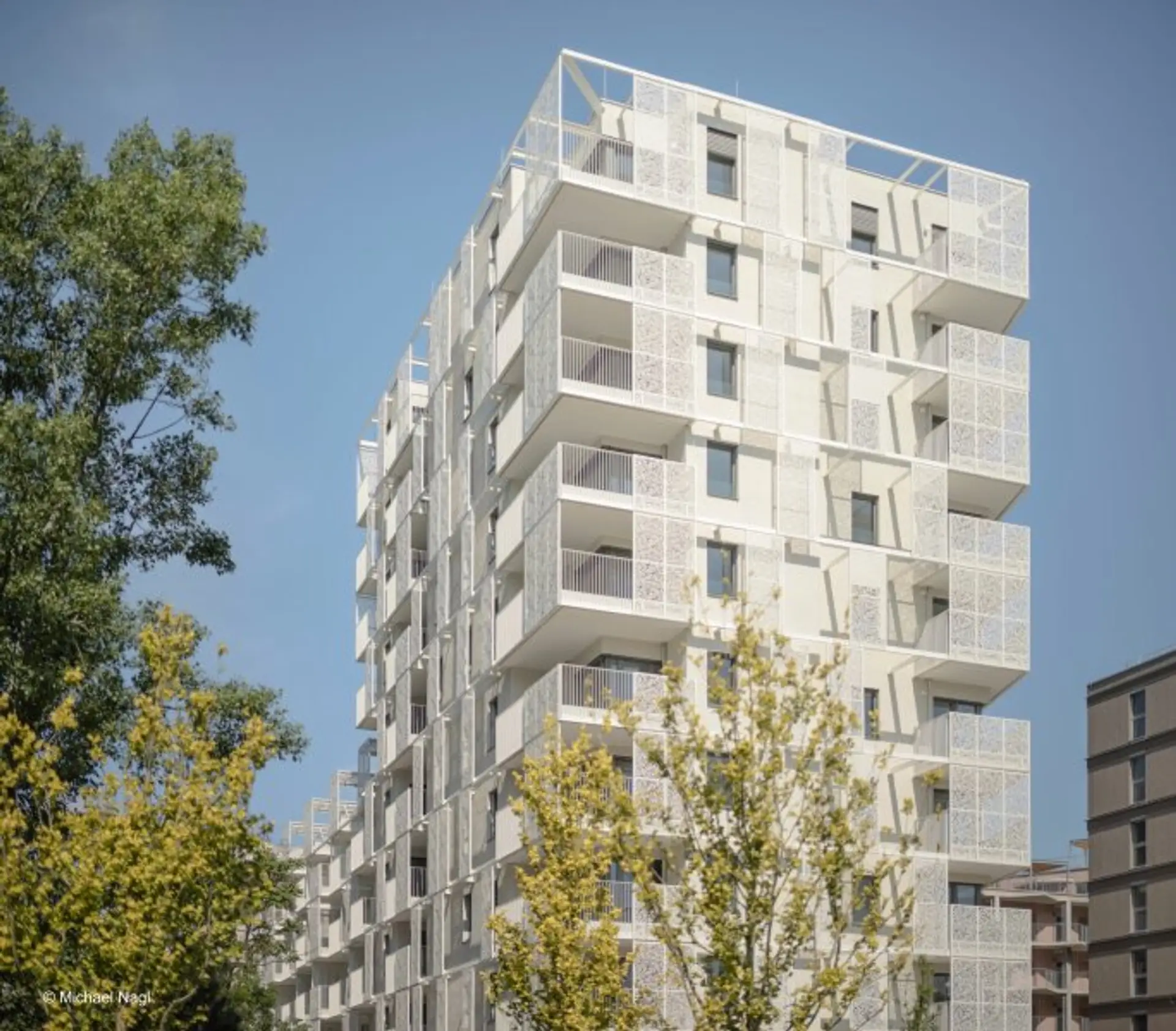 * künstlerisch ausgestaltete Metallpaneele mit floralem Muster als Sonnen- und Sichtschutz an der Fassade