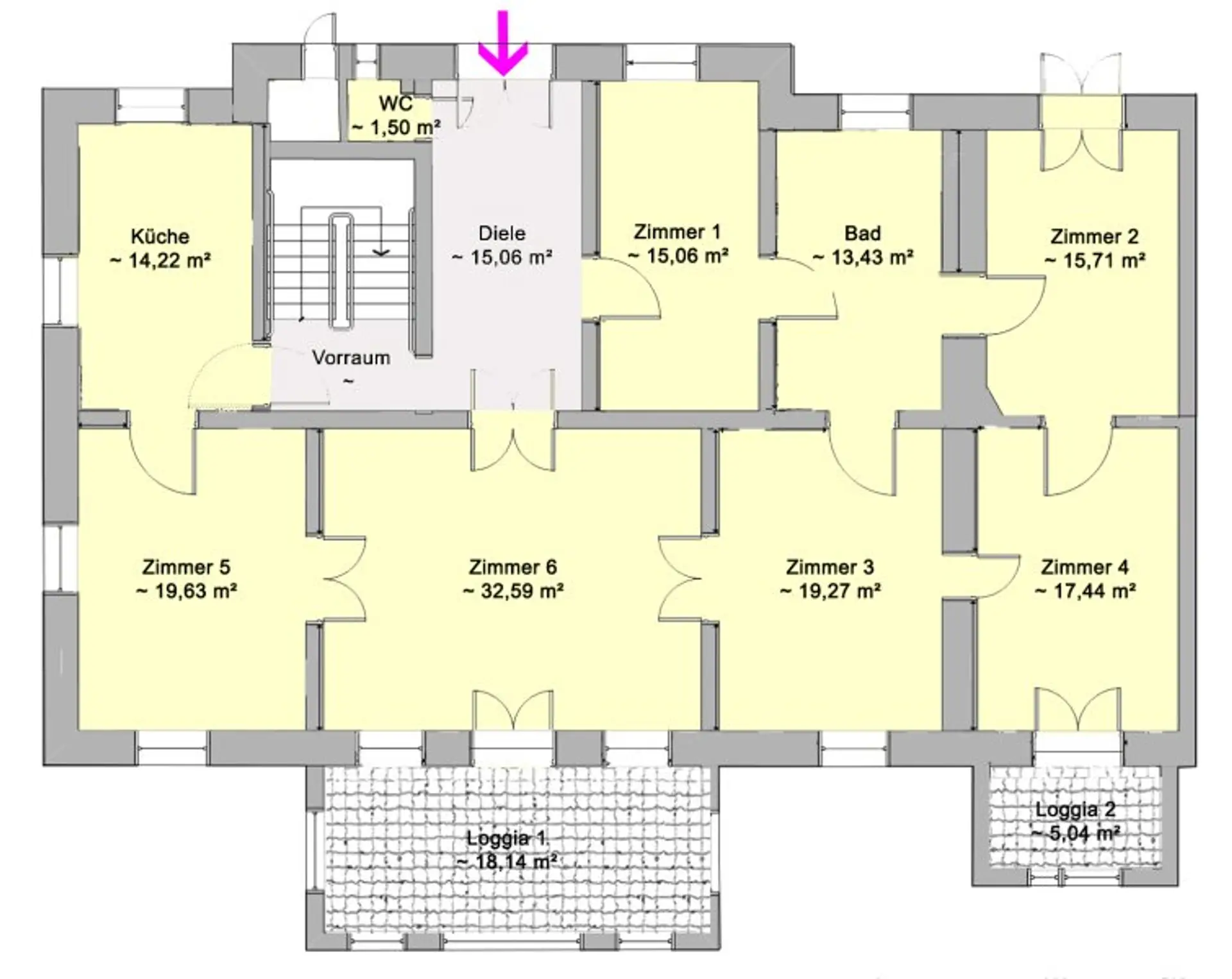 Unterteilt in Diele, Küche, Esszimmer (Zimmer 5), Wohnzimmer (Zimmer 6) mit Ausgang auf die südseitige, verglaste Loggia mit traumhaften Blick in den Garten, Dusche, WC und Waschmaschinenanschluss, separates WC und vier Zimmer, deckt die ca. 187 m² große Wohnfläche überdurchschnittlichen Platzbedarf und ist daher auch sehr gut WG-geeignet. Von Zimmer 4 gibt es einen Ausgang auf eine weitere, kleinere Loggia. Die Küche wird - nach Rücksprache - vom Vermieter eingebaut.