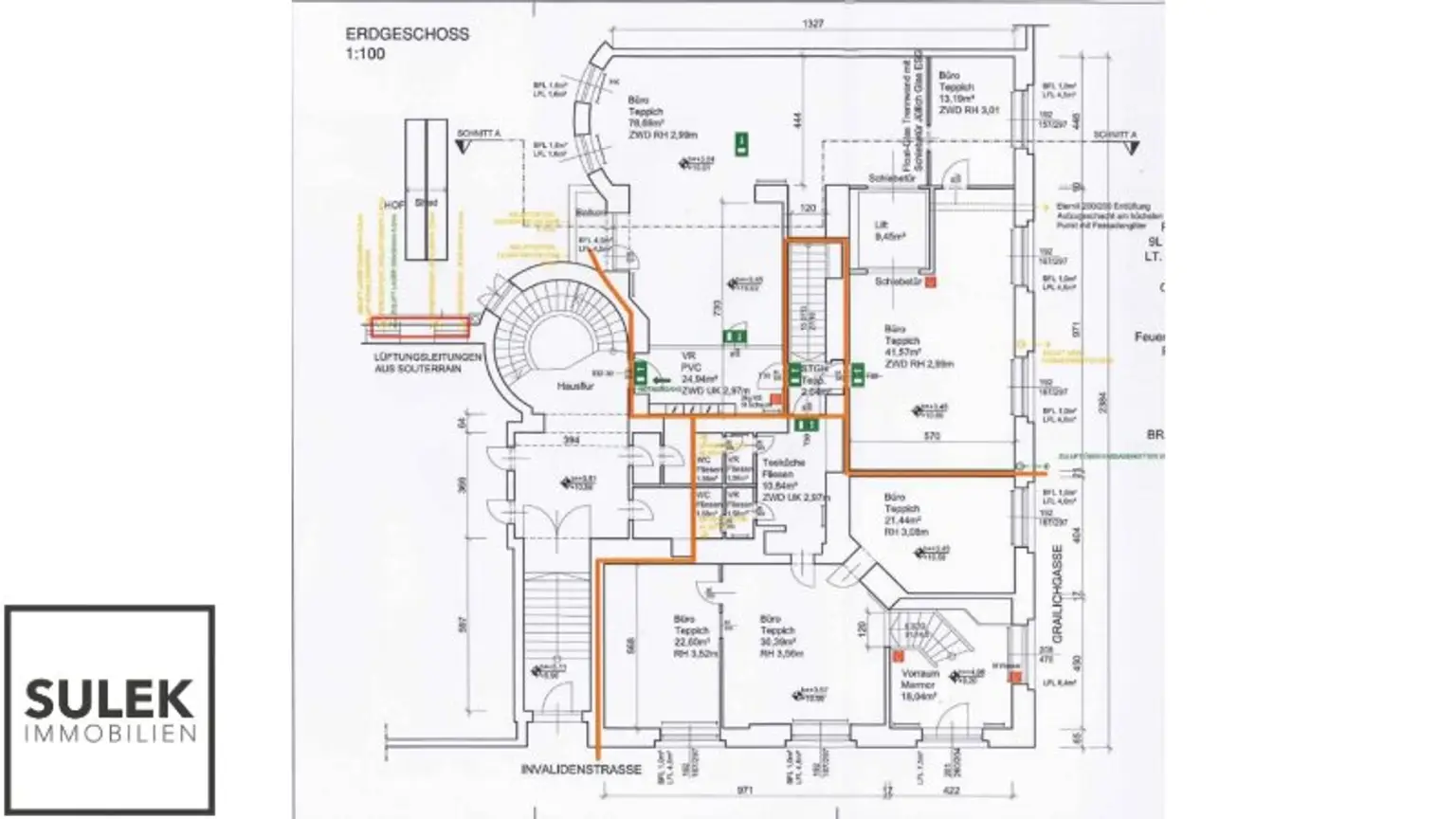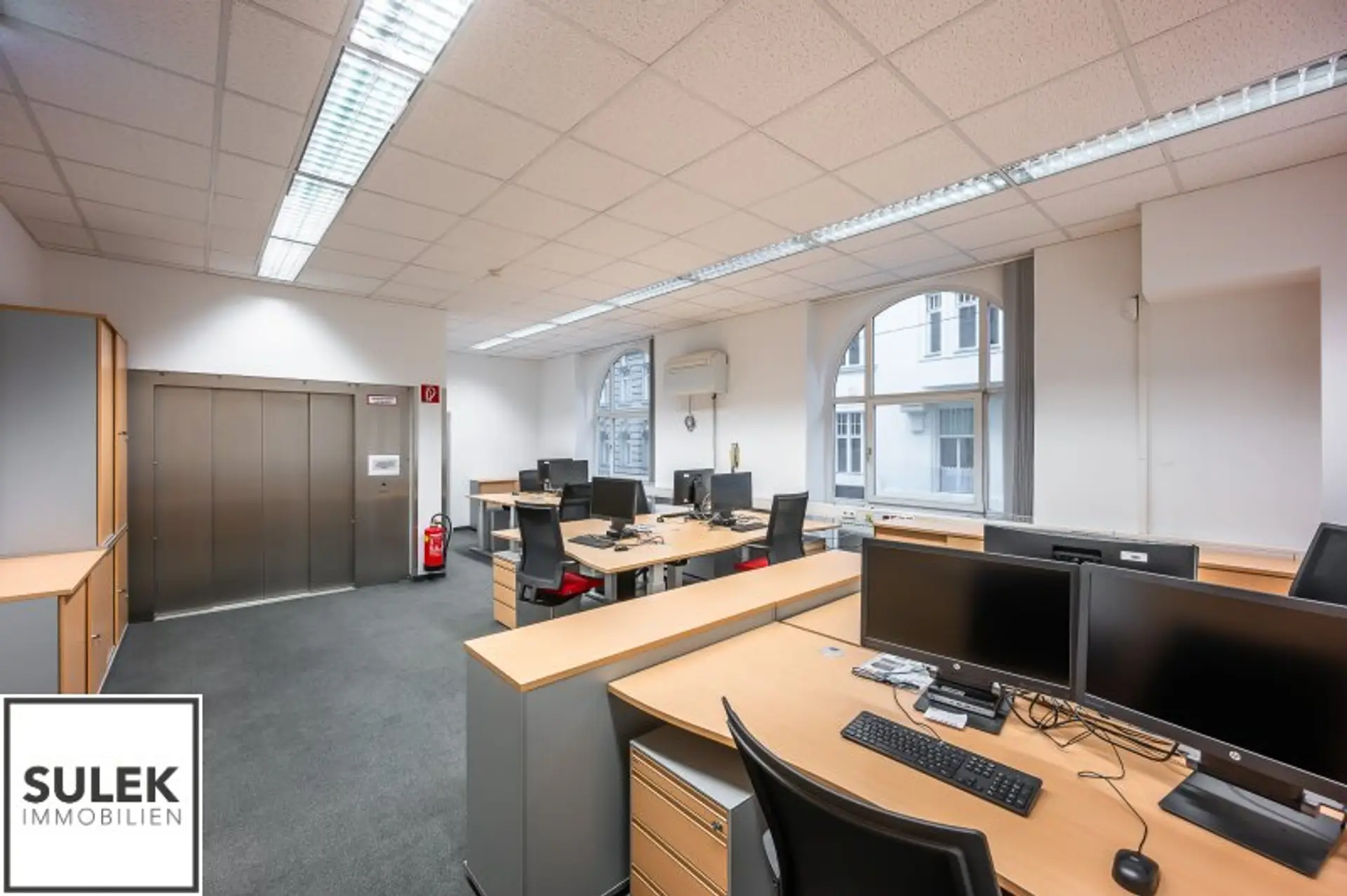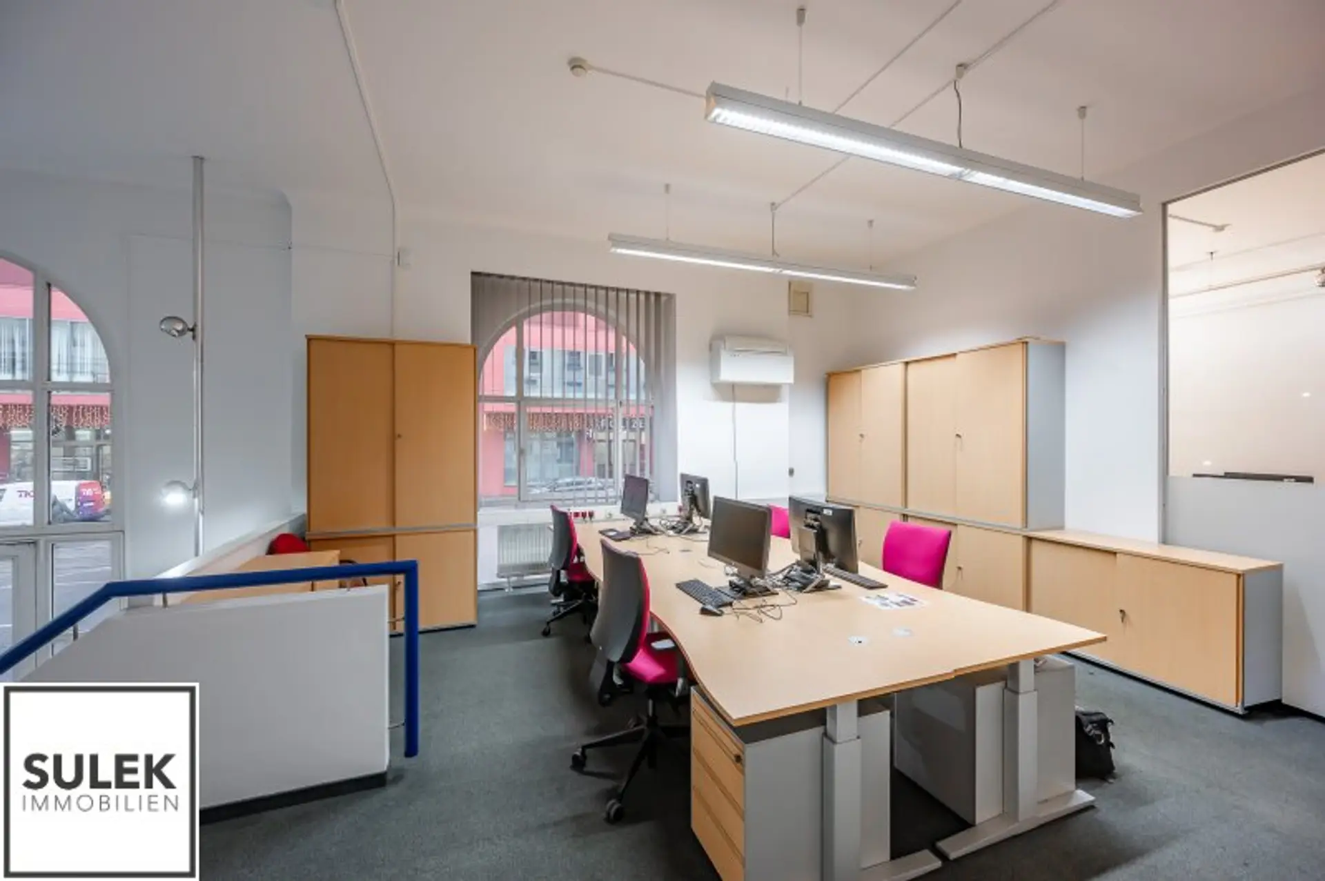 Das Büro befindet sich im Erdgeschoss / Hochparterre, das ebenerdig über einen Vorraum und wenige Stufen erreichbar ist. Hier erwarten Sie mehrere helle Büro- und Besprechungsräume, ein Küchenbereich, Sanitäranlagen sowie ein Gang mit direktem Anschluss an das Stiegenhaus. Die interne Verbindung zwischen den Ebenen erfolgt komfortabel über eine innenliegende Treppe sowie einen Lastenaufzug.