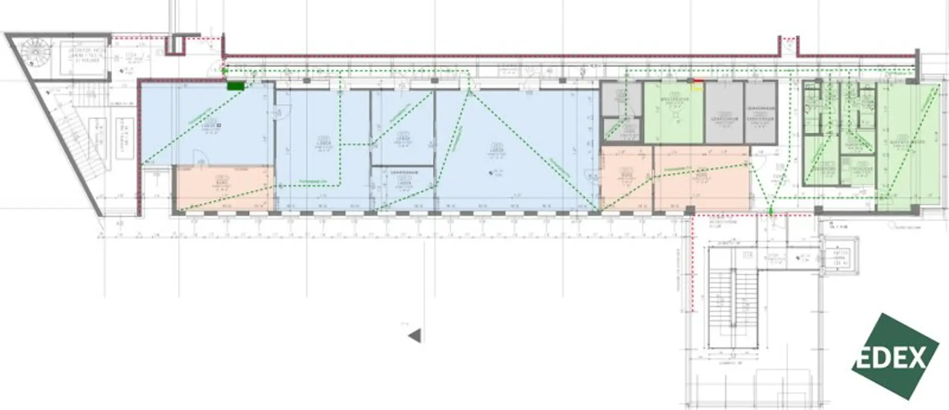 * Technische Infrastruktur: unter anderem - Decken-Fan-Coils, umfassende IT- und Stromverkabelung (230V/AC, teilweise 400V/AC), Netzwerkanbindungen an Arbeitsplätzen