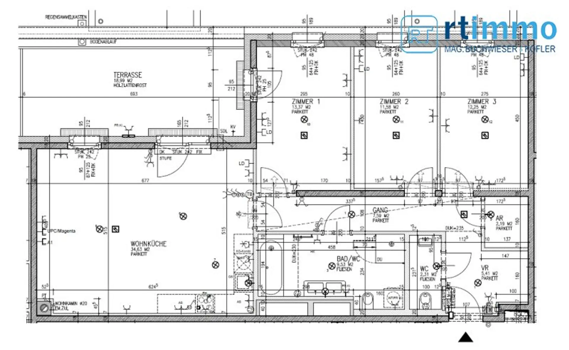 Vorraum, Wohnküche züsatzlich 3 getrennt begehbare Zimmer, Wannenbad mit Dusche und Doppelhandwaschbecken, Abstellraum, WC