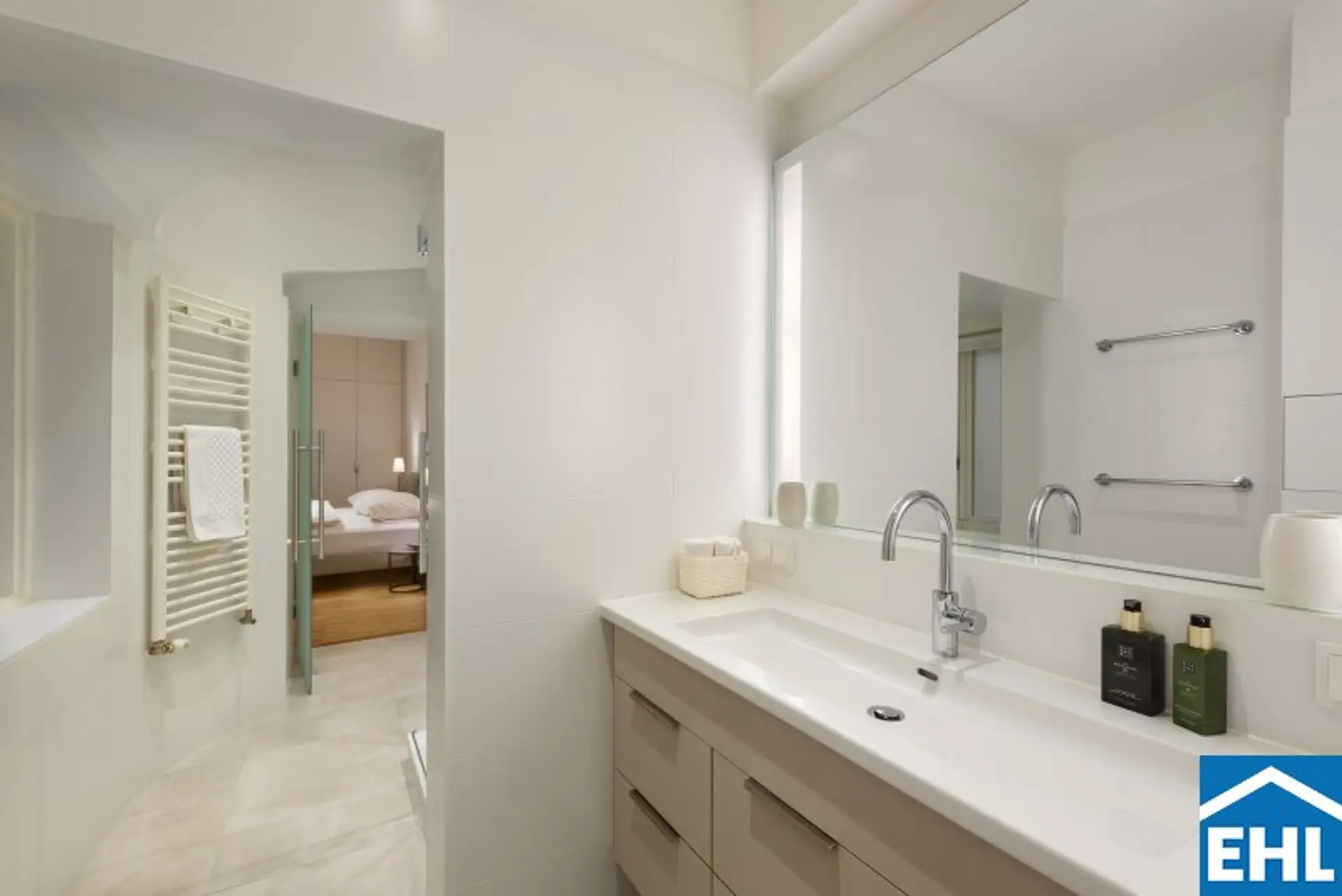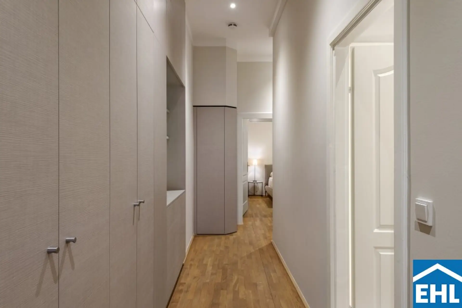 Zwei absolut ruhig gelegene Schlafzimmer sorgen für Privatsphäre und Erholung. Jedes Schlafzimmer verfügt über ein eigenes Bad: Das erste ist mit Dusche und WC ausgestattet, das zweite mit Badewanne, Dusche, Doppelwaschbecken und WC – perfekt für Familien oder Gäste. Beide Schlafzimmer sind mit komfortablen Betten und Nachttischen eingerichtet, sodass Sie sich sofort wie zu Hause fühlen. Ein praktischer Schrankraum mit Tischlermöbeln bietet zusätzlichen Stauraum. Ergänzt wird die Wohnung durch einen Vorraum mit Gäste-WC.
