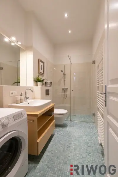 * BADEZIMMER: mit Walk-in-Dusche, Waschbecken mit Unterschrank, WM-Anschluss (inkl. Waschmaschine) und WC