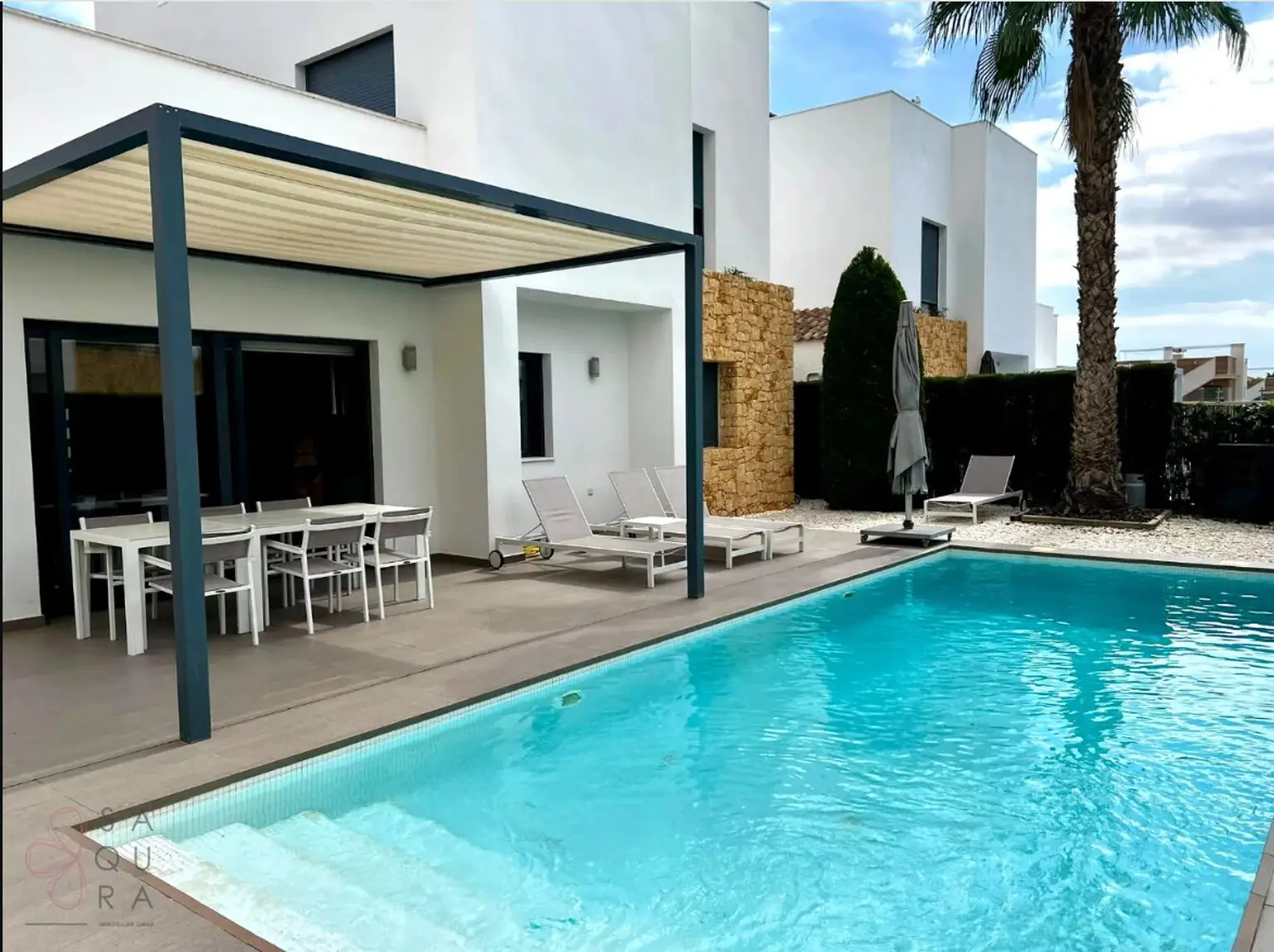 Diese moderne Villa ist komplett instapklar und bietet ein sehr komfortables Wohnambiente in einer gepflegten, eingefriedeten Wohnanlage. Ein schön angelegter Zugang mit Palmen und tropischen Pflanzen führt Sie zum privaten Eingangstor und weiter ins Haus. Die Immobilie kombiniert große Wohnbereiche, mehrere Terrassen, ein Solarium und einen beheizten Privatpool – ideal für Wohnen, Urlaub oder Vermietung.