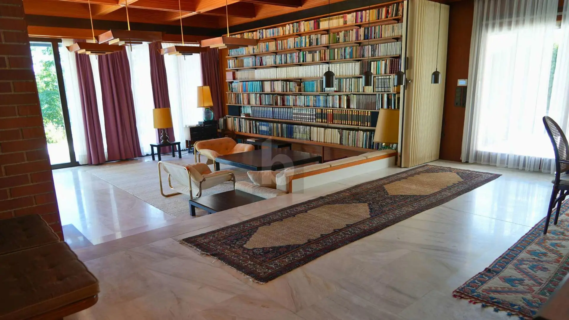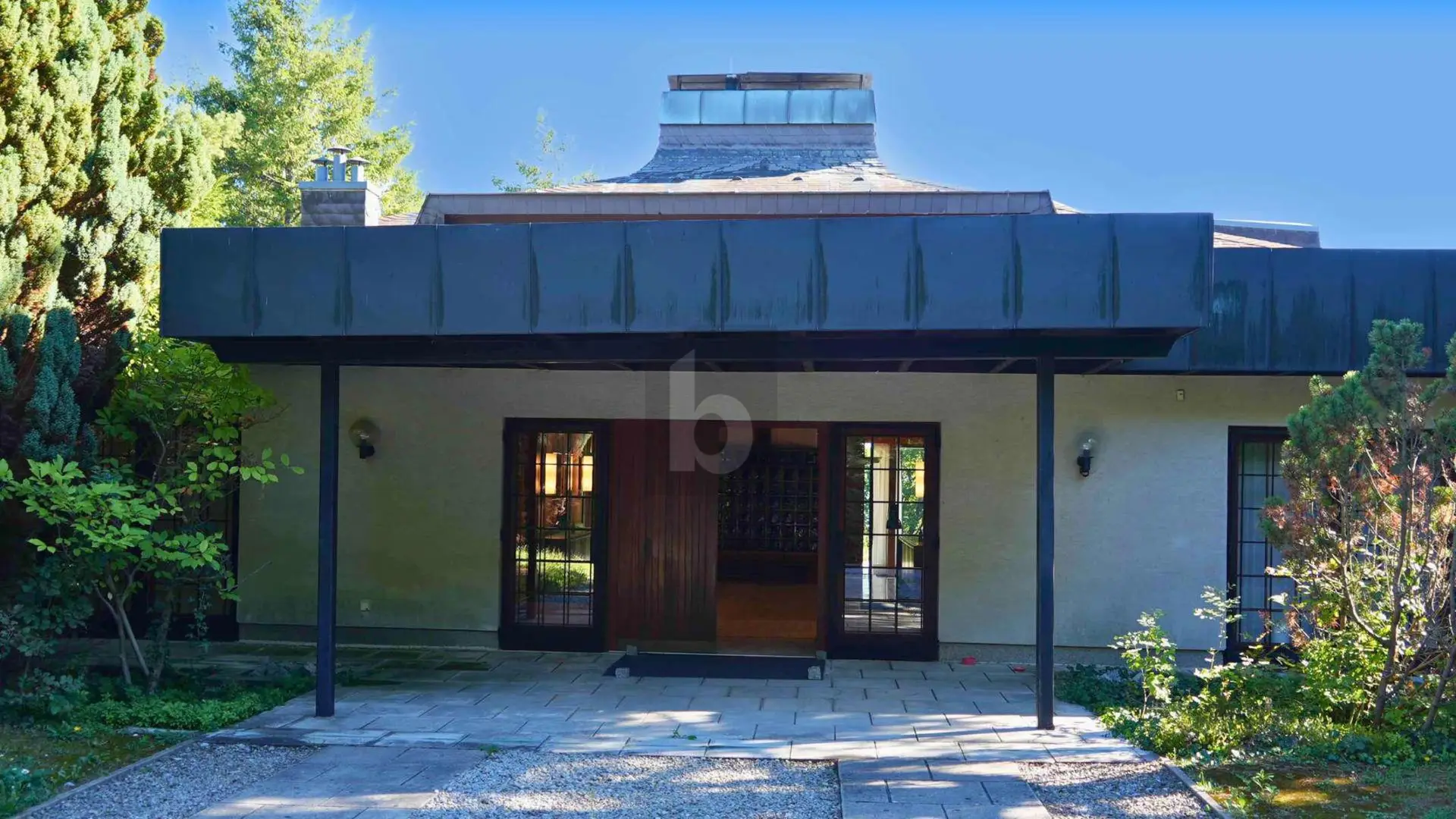 Matt schimmernd weitet sich der weiße Marmorboden vom Entrée, wird beim zentral platzierten offenen Kamin zum schwebenden Podest und leitet über in den Salon mit durchgängiger Glasfassade. Kühn und erhaben spannt sich die Kassettendecke über fast 15 m Breite, begleitet von einer Ebene aus Leuchten, die den Raum in warmes Licht tauchen. Ein Raum, der von der Stille feiner Gedanken ebenso zeugt, wie von der Opulenz rauschender Feste in großer Gesellschaft. Unmittelbar tritt man ins Freie auf den vorgelagerten Außenbereich. Durch das üppige Grün eines parkähnlichen, uneinsichtigen Gartens schweift der Blick bis hinaus zur silbrigen Wasserfläche des Neusiedlersees. Diese repräsentative Villa ist das Meisterwerk des Architekten Vladimir Hradil. Kompromisslos in seinem Qualitätsanspruch, vereint er hier die Exklusivität der erhöhten Lage am Hang des Leithagebirges mit hochwertigen Materialien zu einem zeitlos gültigen Gesamtkunstwerk.