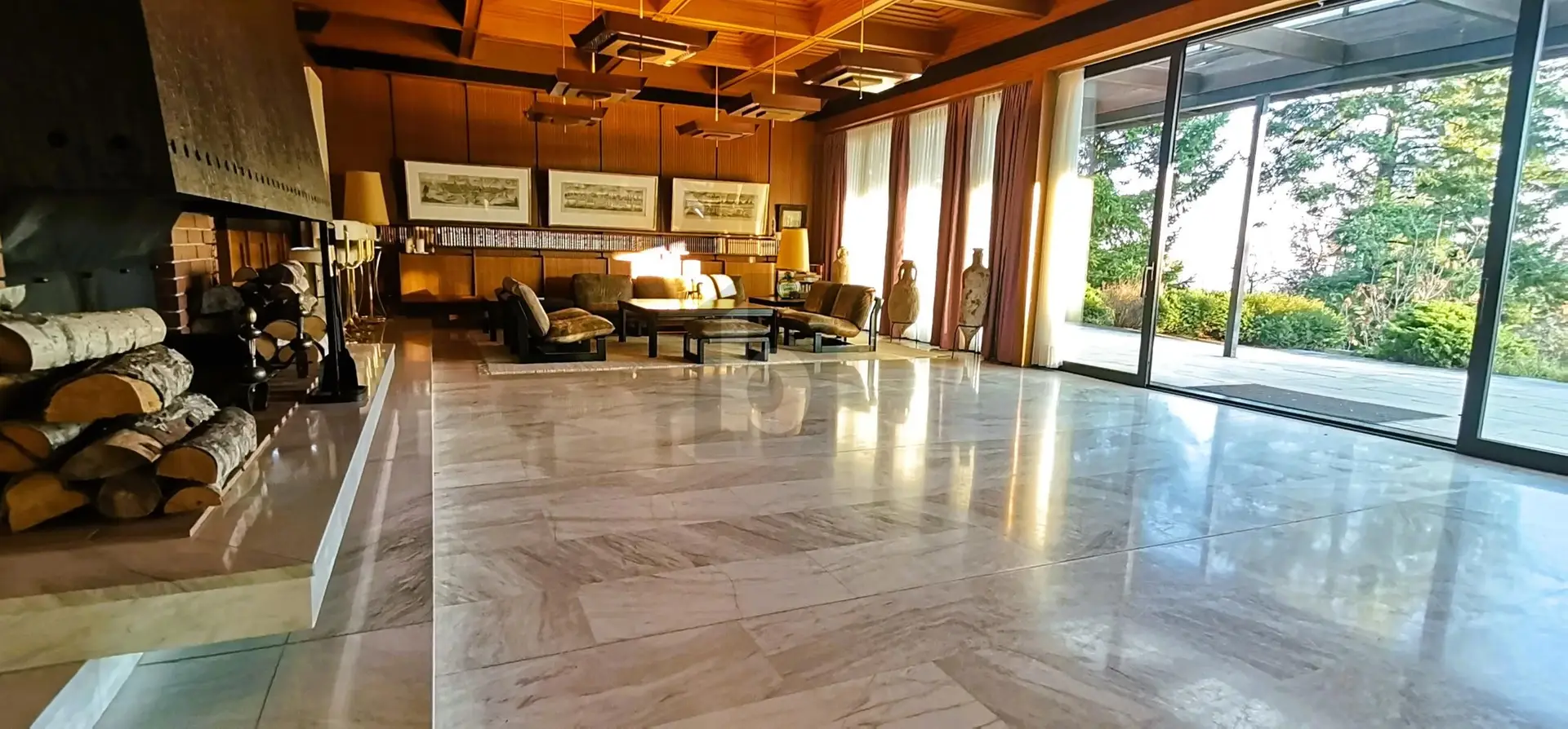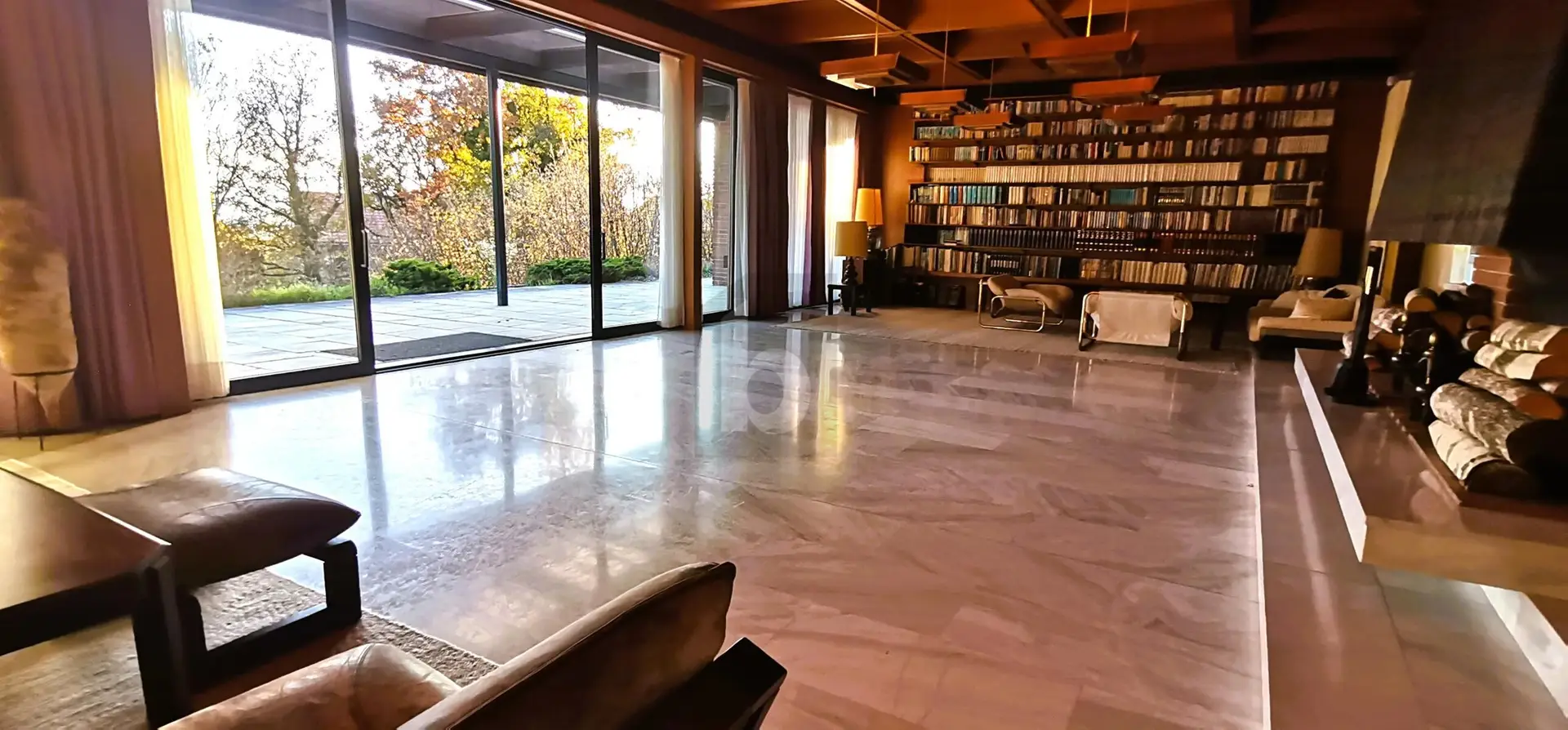 Matt schimmernd weitet sich der weiße Marmorboden vom Entrée, wird beim zentral platzierten offenen Kamin zum schwebenden Podest und leitet über in den Salon mit durchgängiger Glasfassade. Kühn und erhaben spannt sich die Kassettendecke über fast 15 m Breite, begleitet von einer Ebene aus Leuchten, die den Raum in warmes Licht tauchen. Ein Raum, der von der Stille feiner Gedanken ebenso zeugt, wie von der Opulenz rauschender Feste in großer Gesellschaft. Unmittelbar tritt man ins Freie auf den vorgelagerten Außenbereich. Durch das üppige Grün eines parkähnlichen, uneinsichtigen Gartens schweift der Blick bis hinaus zur silbrigen Wasserfläche des Neusiedlersees. Diese repräsentative Villa ist das Meisterwerk des Architekten Vladimir Hradil. Kompromisslos in seinem Qualitätsanspruch, vereint er hier die Exklusivität der erhöhten Lage am Hang des Leithagebirges mit hochwertigen Materialien zu einem zeitlos gültigen Gesamtkunstwerk.