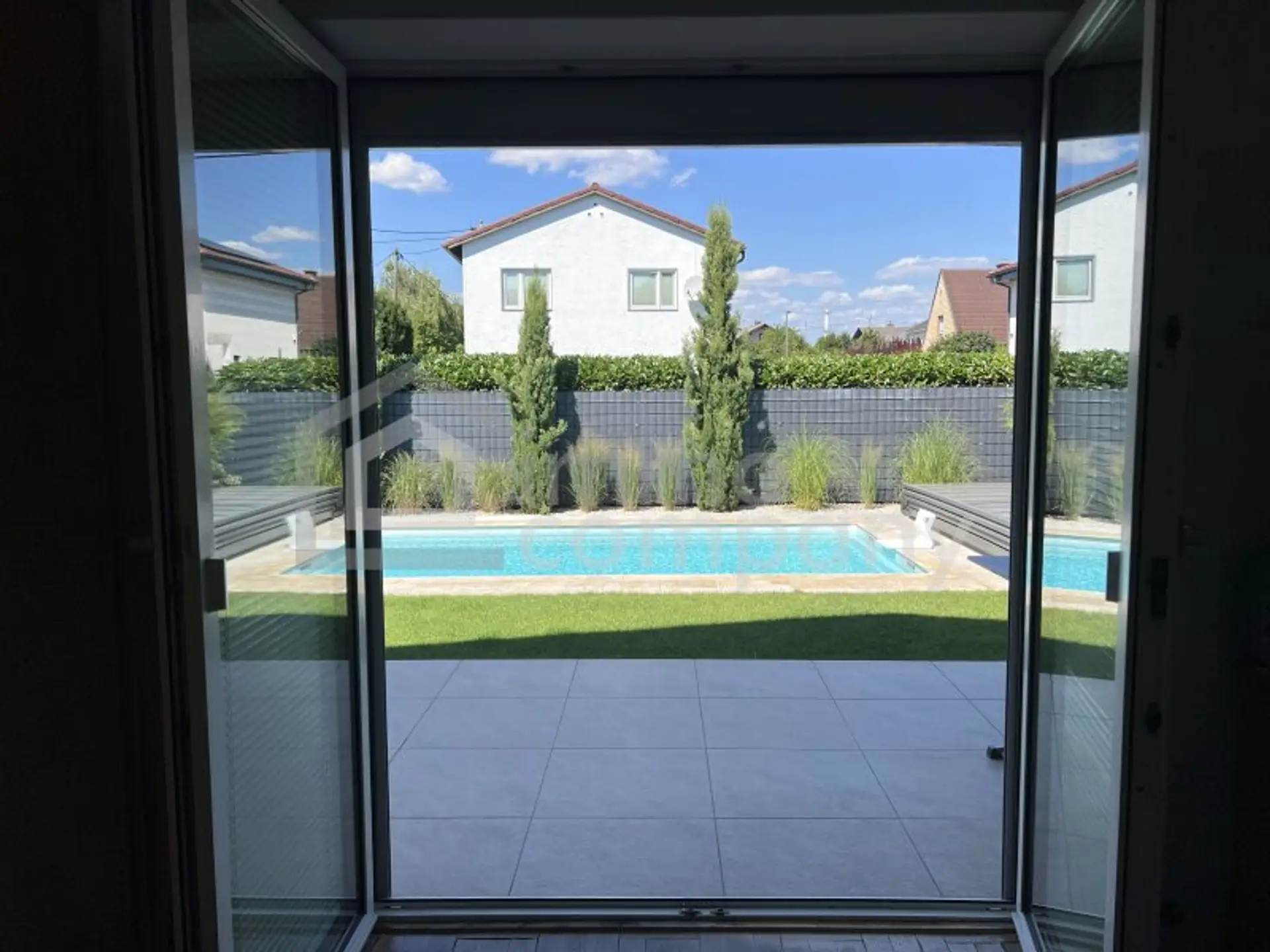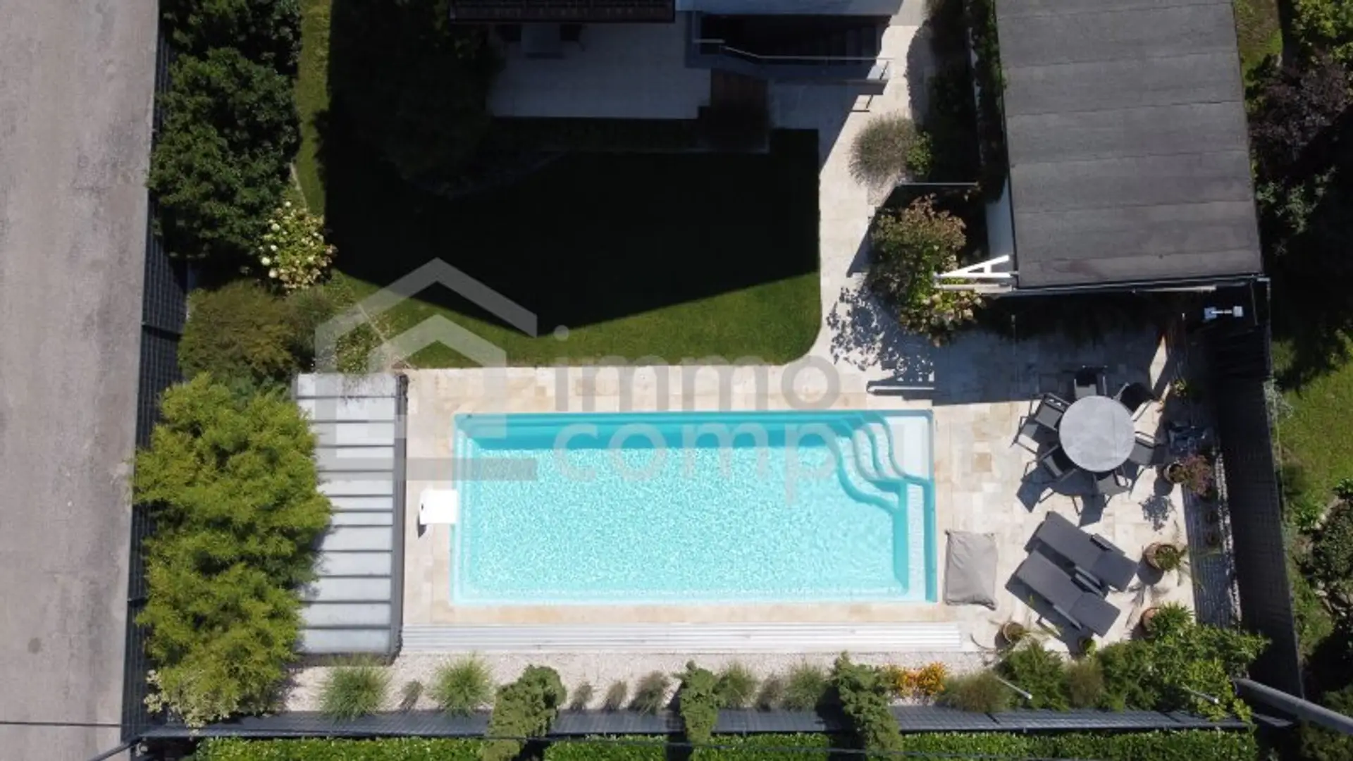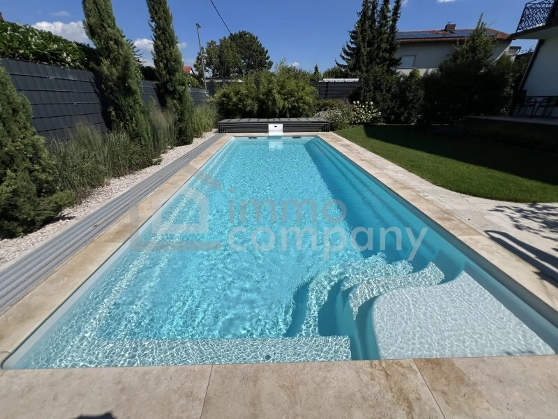 Das 683 m² große Grundstück bietet eine Gartenanlage mit beheiz- und kühlbarem Pool sowie eine Garage. Im ca. 90m² großen Keller stehen Technikräume, eine Waschküche und viel Stauraum zur Verfügung. Die Beheizung erfolgt über eine Gaszentralheizung.