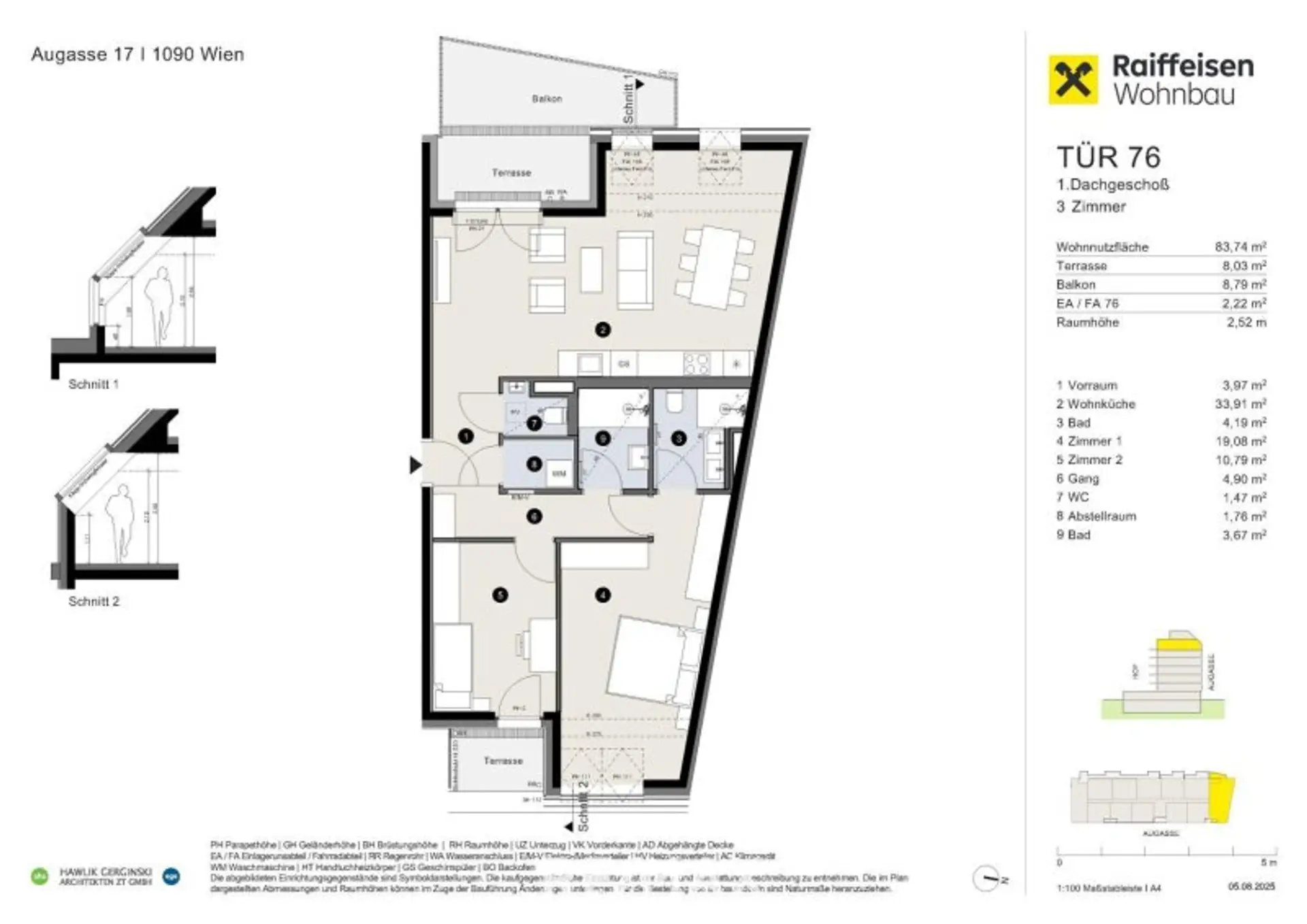 In ausgezeichneter Lage in der Augasse 17 in 1090 Wien entsteht ein begehrter, hochwertiger Neubau. Die Straßenbahnlinie D fährt vor der Tür und führt einerseits über den Franz-Josefs-Bahnhof und die Station Schottentor zur Oper, als auch andererseits zu den Weinbergen Grinzings. Die U4/U6 Station Spittelau ist fußläufig rasch erreicht.
