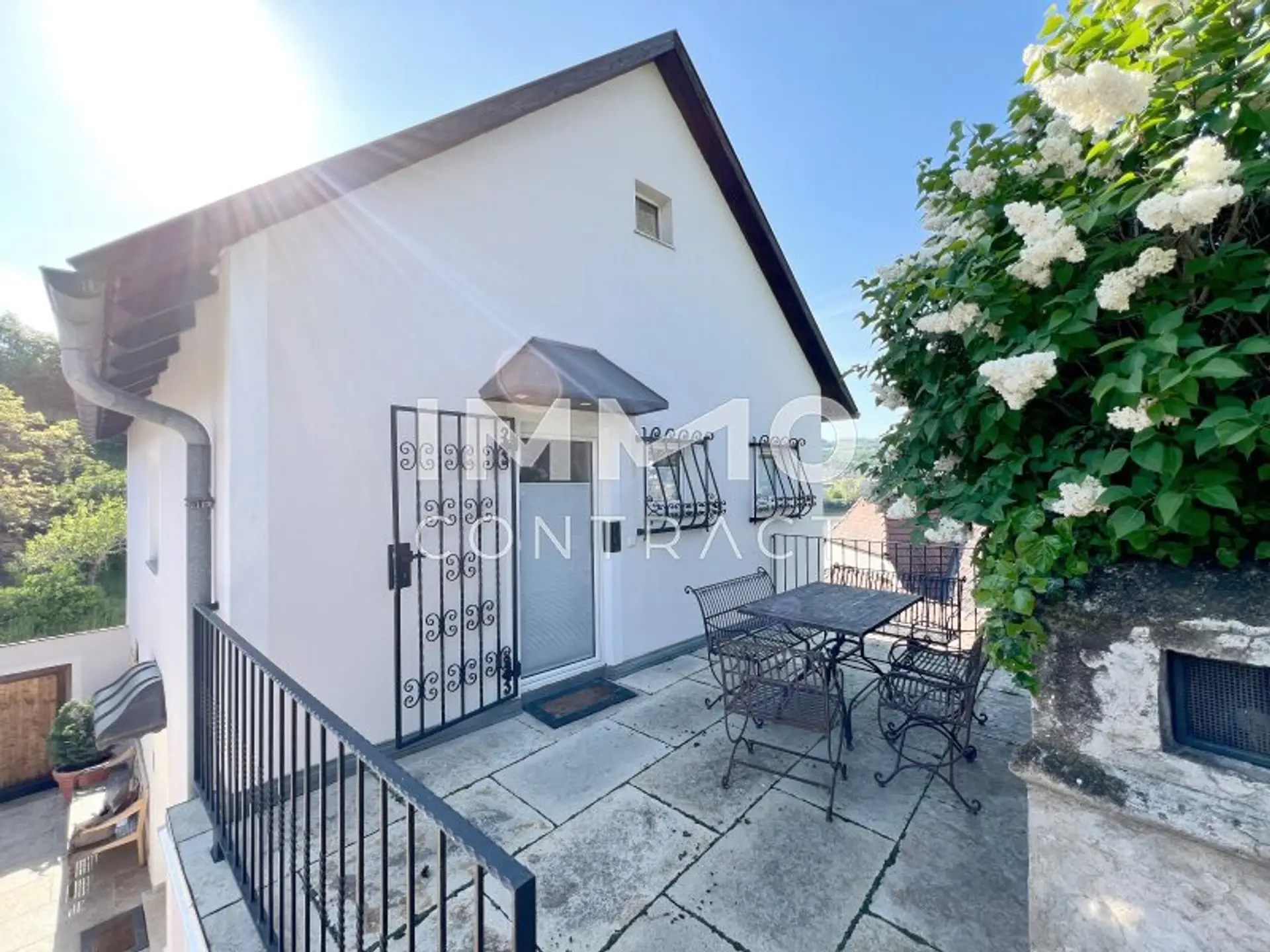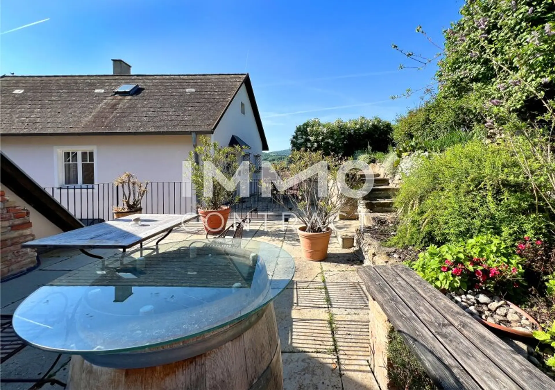 etwas versteckt und doch erhaben, mit Blick über die ziegelroten Dächer der umliegenden Häuser bis an die Donau und den sanften Hängen der VINEA Toplagen.