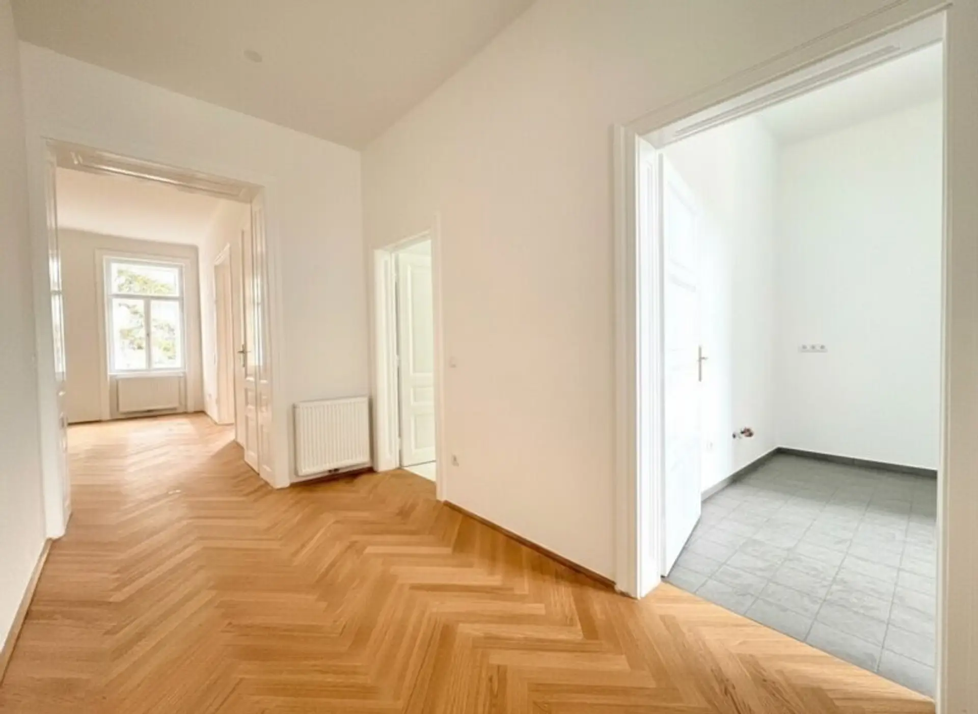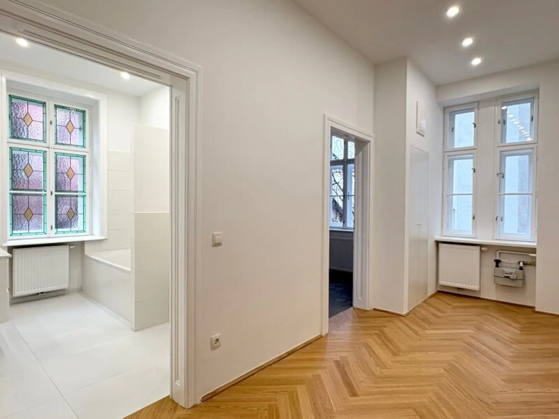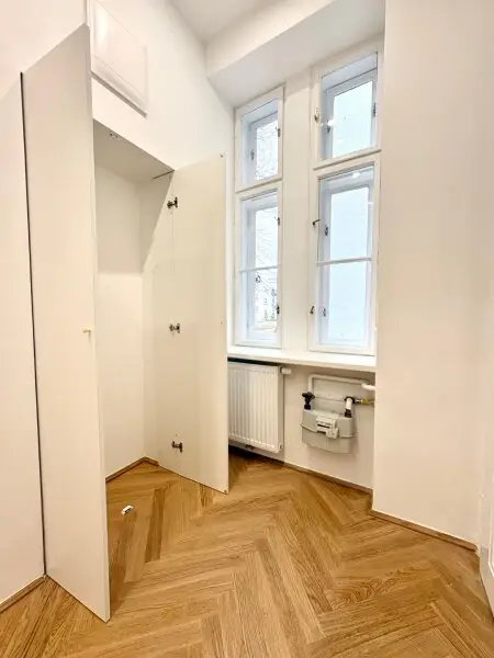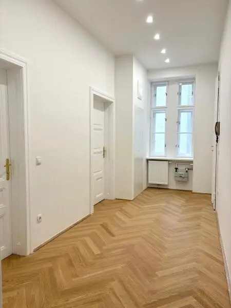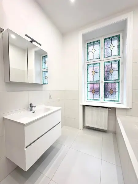 Die Wohnung im 1. Stock mit Lift verfügt über ca. 65m² Wohnfläche und zwei gut geschnittene Zimmer, die vielseitig nutzbar sind – ob als Wohn- und Schlafzimmer oder als Wohn- und Arbeitsbereich. Die separate Küche bietet ausreichend Platz zum Kochen und Genießen. Ein echtes Highlight ist das wunderschöne Badezimmer mit Badewanne, Waschmaschinenanschluss, WC und einem charmanten Buntglasfenster, das für besonderes Licht und eine ganz eigene Note sorgt. Ein geräumiges Vorzimmer rundet das stimmige Raumkonzept ab. Im Zuge der Sanierung wurde ein wunderschöner neuer Fischgrät-Parkettboden verlegt und die originalen Details, soweit möglich, erhalten. Elektrik und Heizung (Gas-Etagenheizung) wurden komplett erneuert. Das elegante Badezimmer verfügt über zeitlose, großformatige weiße Fliesen. In der Küche sind die Anschlüsse bereits vorbereitet. Ein Kellerabteil ist zugeordnet.