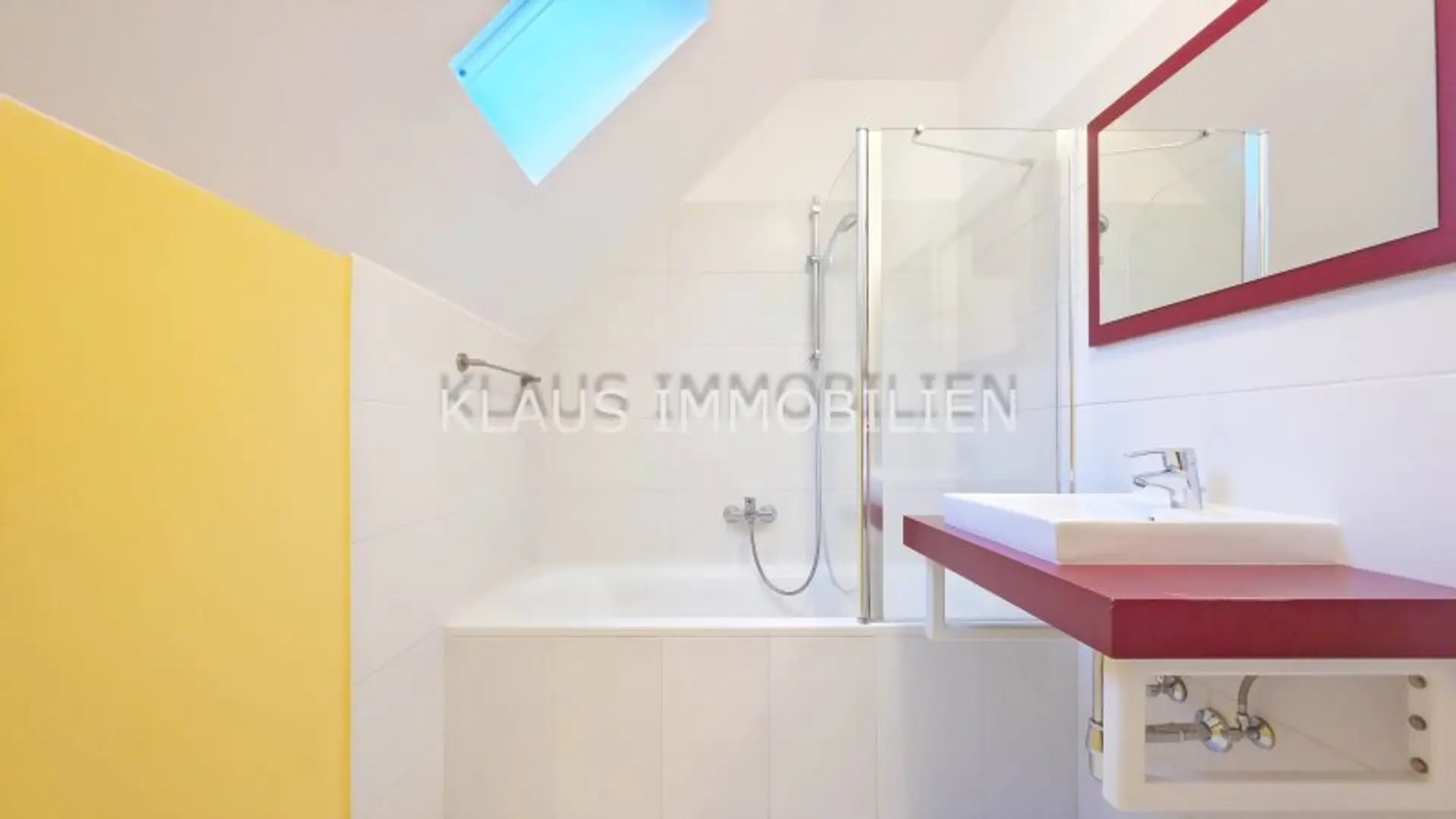 Das Badezimmer ist sehr hell und mit zeitgemäßen Fliesen verlegt. Sie haben eine Badewanne mit Duschwand, sehr praktisch.