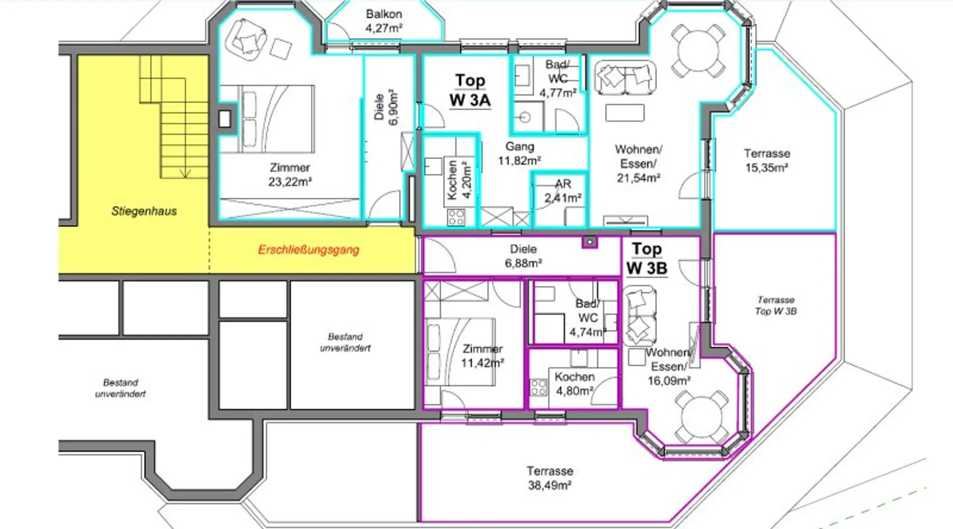 Die Wohnung hat eine Fläche von ca. 43,93 qm und ca. 38,49 qm Terrassenflächen. Die Wohnung Top 3b entstand in dieser Form mit bewilligtem Baubescheid 2023, als die damalige Top 3 in Top 3a und Top 3b unterteilt wurde. Die zwei Einheiten könnten grundsätzlich, aus baulicher Sicht, auch wieder zusammengelegt werden.