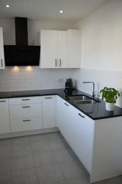 * Boden: Vinyl - schwarz in Fliesenoptik, im Bad Fliesen