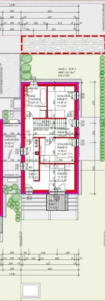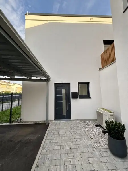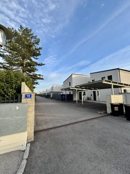 Die Grundstücke wurden über eine neu geschaffene Zufahrtstraße nordöstlich der öffentlichen Leopold Lehnerstraße erschlossen. Jedem Doppelhaus sind nördlich zwei Carports mit je zwei KFZ Abstellplätzen, sowie eine Müllsammelstelle zugeordnet und jede Doppelhaushälfte verfügt über einen großzügigen Eigengarten mit ca. 180 m². In jedem Garten wurde zudem ein praktischer Geräteschuppen mit ca. 3 m² Fläche errichtet.