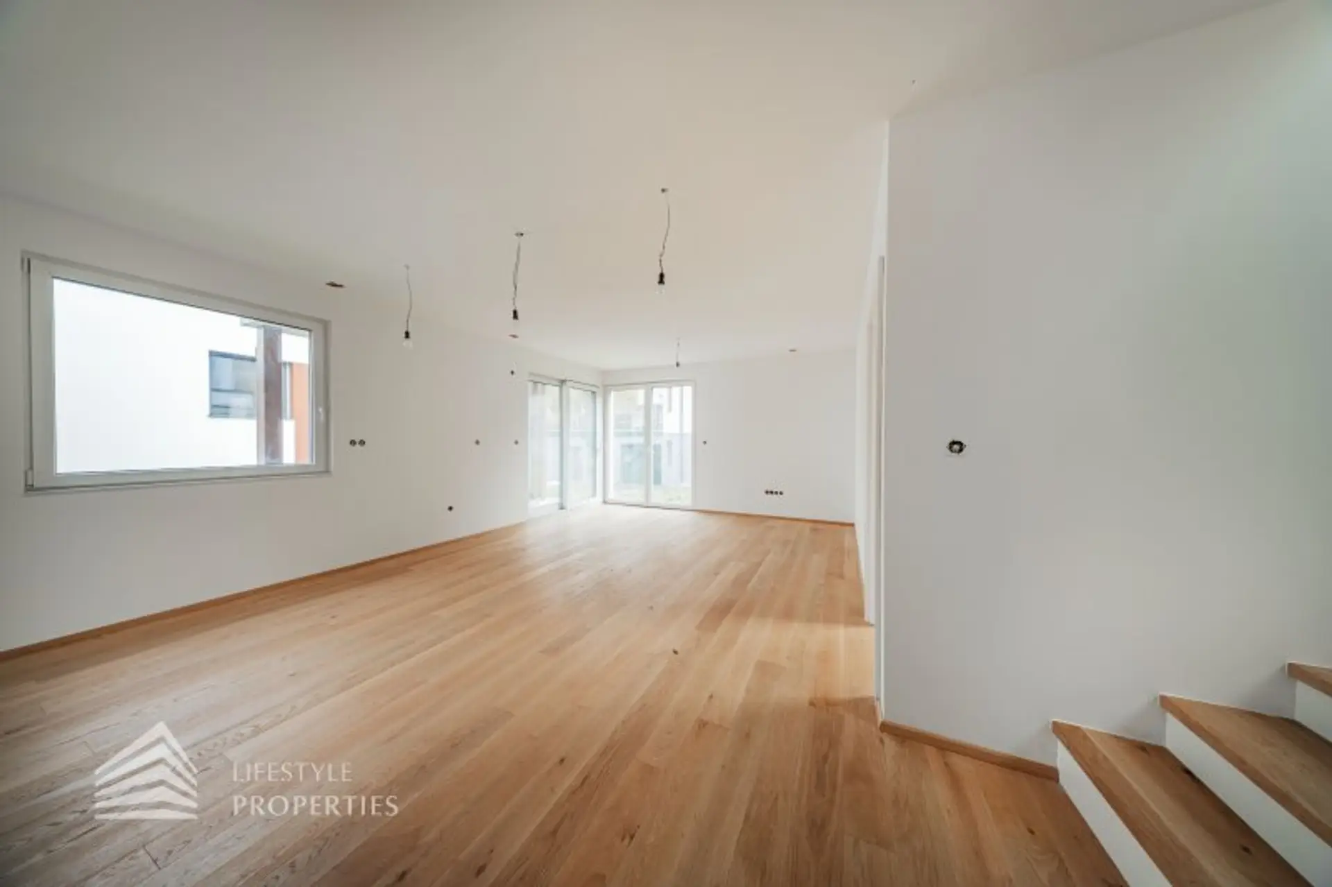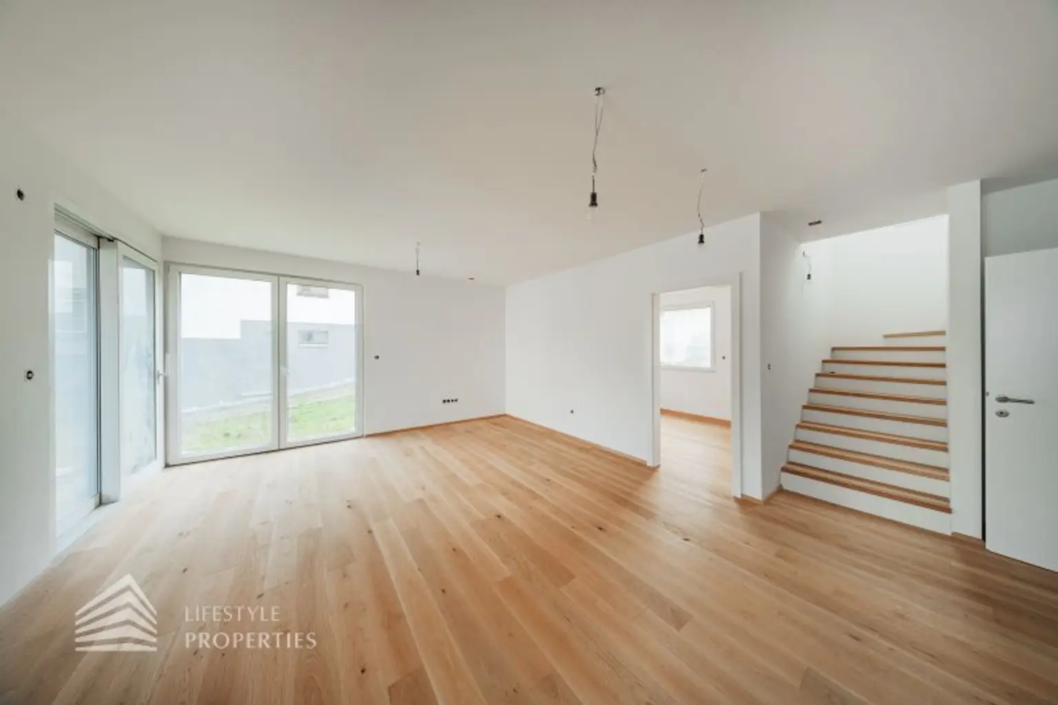 Beim Betreten des Hauses gelangen Sie in einen einladenden Vorraum. Links befindet sich ein Technikraum und ein Gäste-WC. Geradeaus öffnet sich ein lichtdurchflutetes Wohn-Esszimmer, wo eine traumhafte Küche Platz finden kann, mit direktem Zugang zur Terrasse und zu dem traumhaften Garten. Links liegt zudem ein Gästezimmer, das auch als Büro genutzt werden kann. Auf der linken Seite führt eine Treppe ins Obergeschoss.
