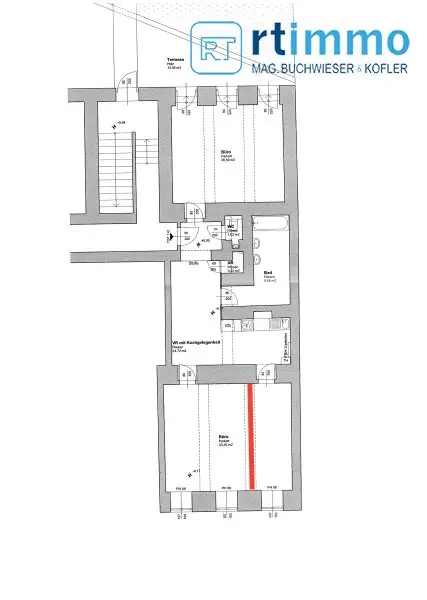 Die Wohnung besteht aus einem großen Vorraum, der alle Zimmer zentral verbindet, einem großen Wohnzimmer, einem großen Schlafzimmer, einem Büro, einem zum Gang offenen Küchenraum mit einer modernen Einbauküche. Ein großes Wannenbad und ein kleiner Abstellraum vervollständigen Ihren Wohntraum.