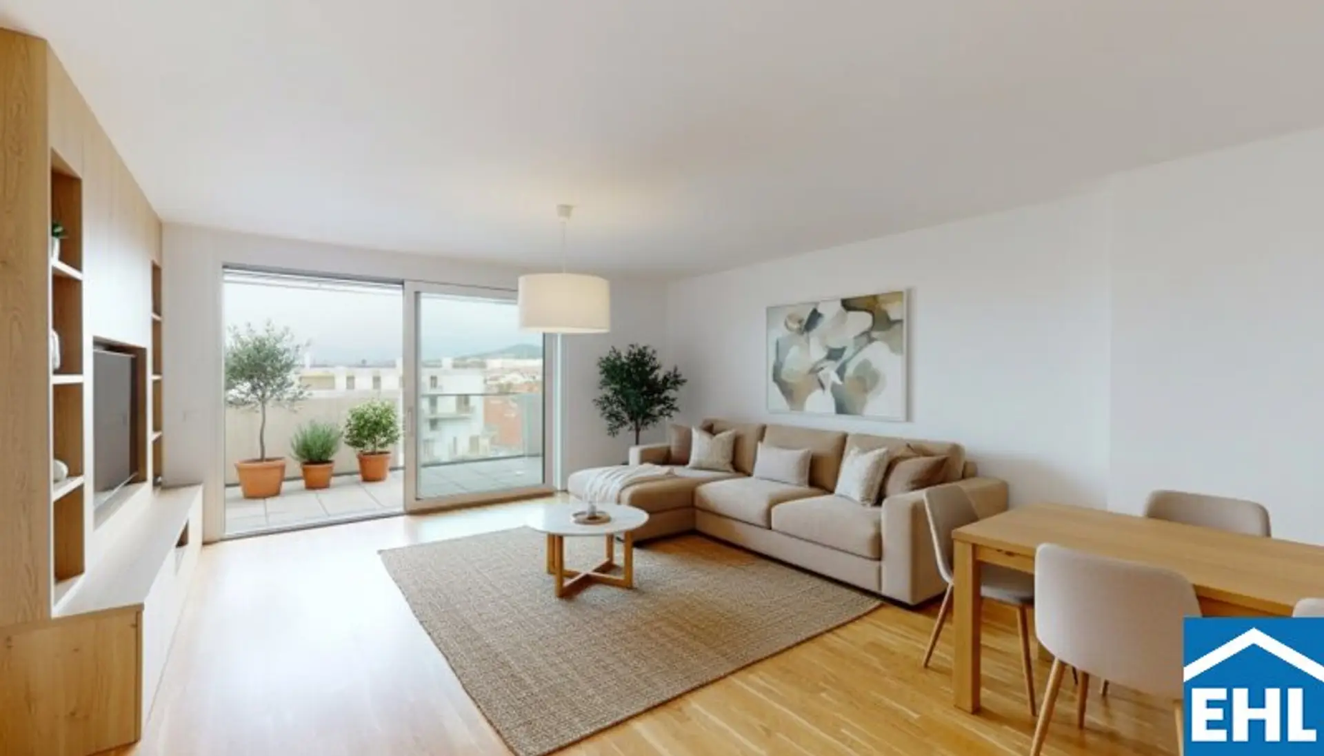 In der 9. Etage von Stiege 2 befindet sich die großzügige 3-Zimmer-Eigentumswohnung TOP 78 mit ca. 115 m² Wohnnutzfläche, inklusive zwei Loggien mit gesamt ca. 21 m² auf beiden Seiten der Wohnung. Der durchgesteckte Grundriss ermöglicht Morgensonne und Abendlicht, während die offen gestaltete Wohnküche mit fast 40 m² das kommunikative Zentrum der Wohnung bildet.