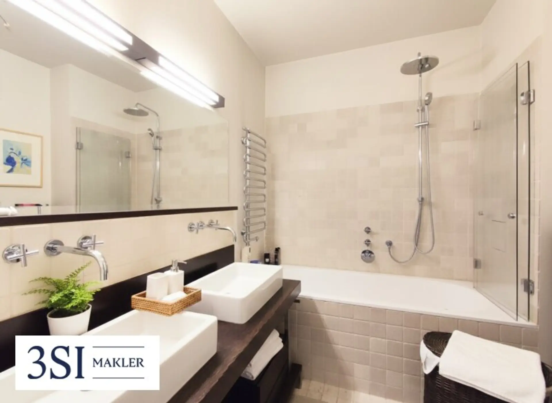 Das Badezimmer mit Badewanne verfügt über zwei Waschbecken und ein WC. Diese außergewöhnliche Wohnung bietet Ihnen nicht nur ein stilvolles Zuhause, sondern auch eine erstklassige Lage im Herzen Wiens. Perfekt für Familien oder Paare, die Wert auf großzügiges Wohnen und ein urbanes Umfeld legen. Eine Fußbodenheizung sorgt für wohltuende Wärme und behagliches Raumklima. Zudem stehen ein Fahrradraum und ein Kellerabteil zur Verfügung.