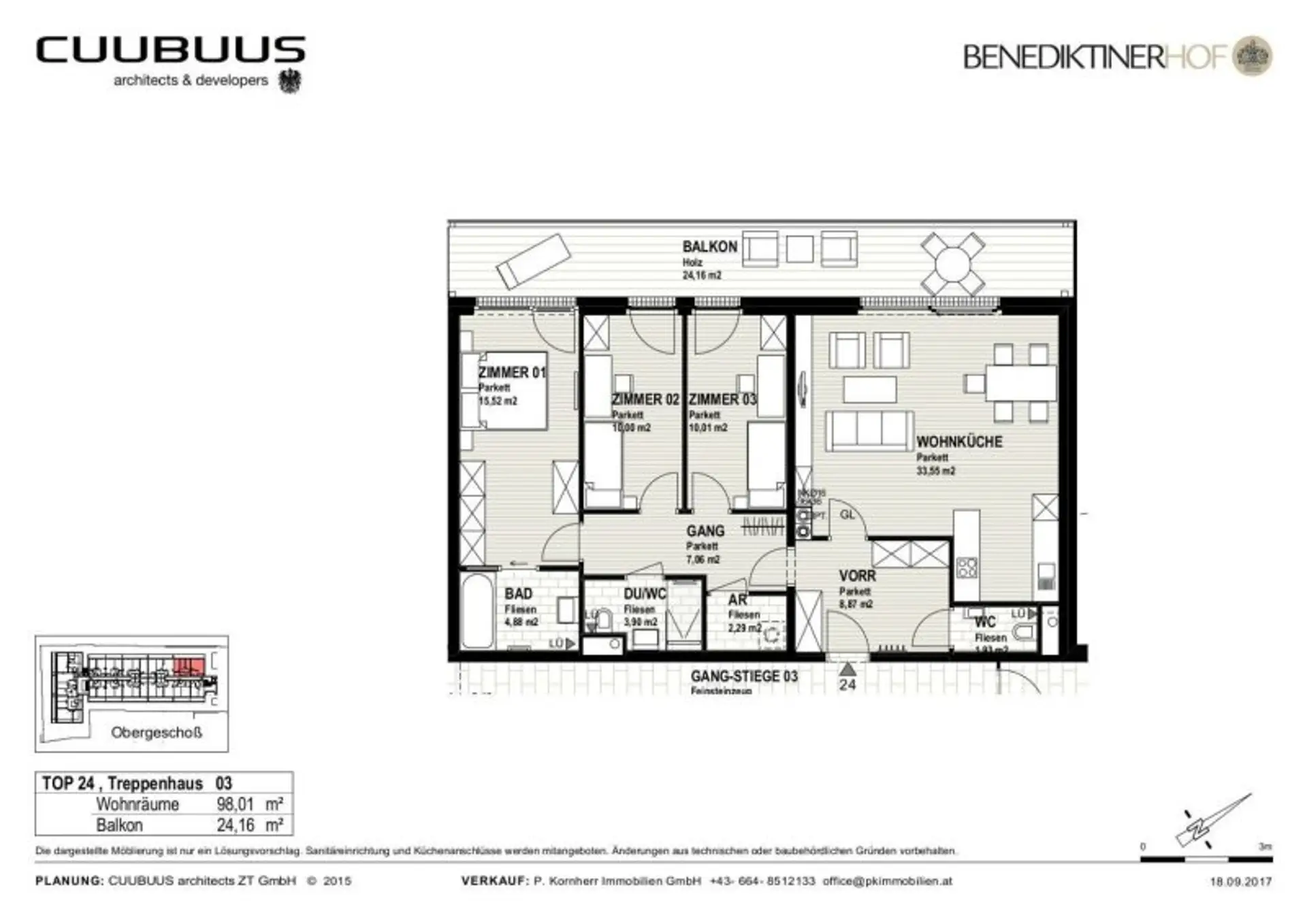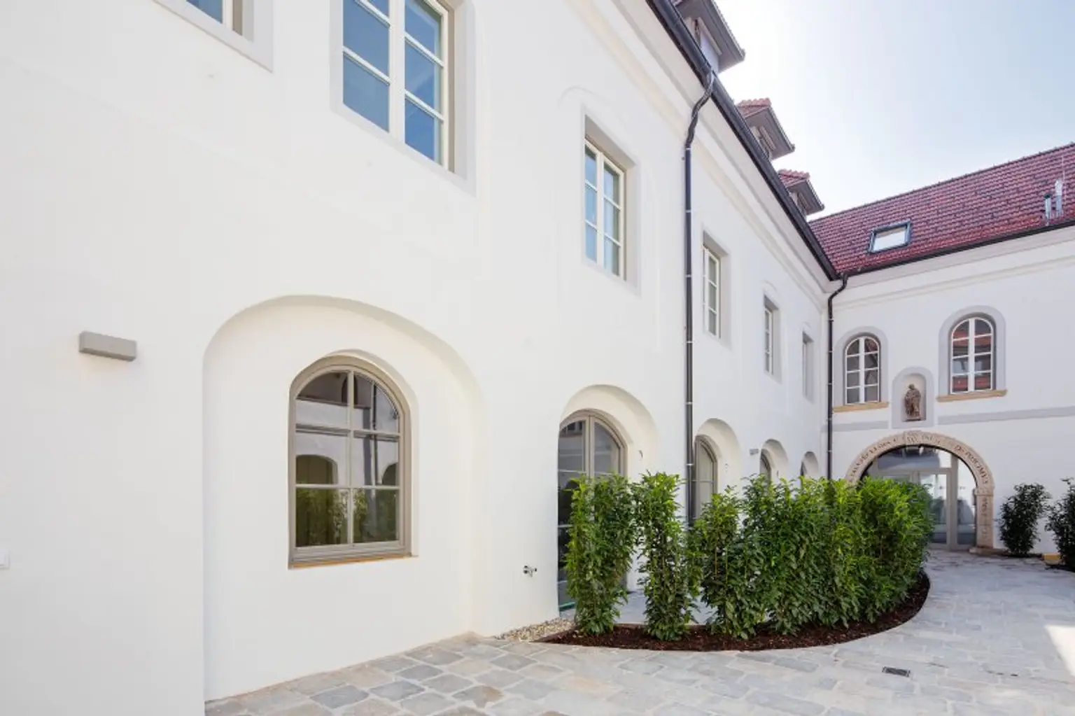 Der Prachtbau aus dem 16 Jhdt. wurde erneuert und das Dachgeschoss ausgebaut. Im hinteren Bereich der Liegenschaft wurde zusätzlich ein Neubaukörper situiert. Beide Teile des Benediktinerhofs sind baulich miteinander verbunden und verfügen über eine gemeinsame Tiefgarage.