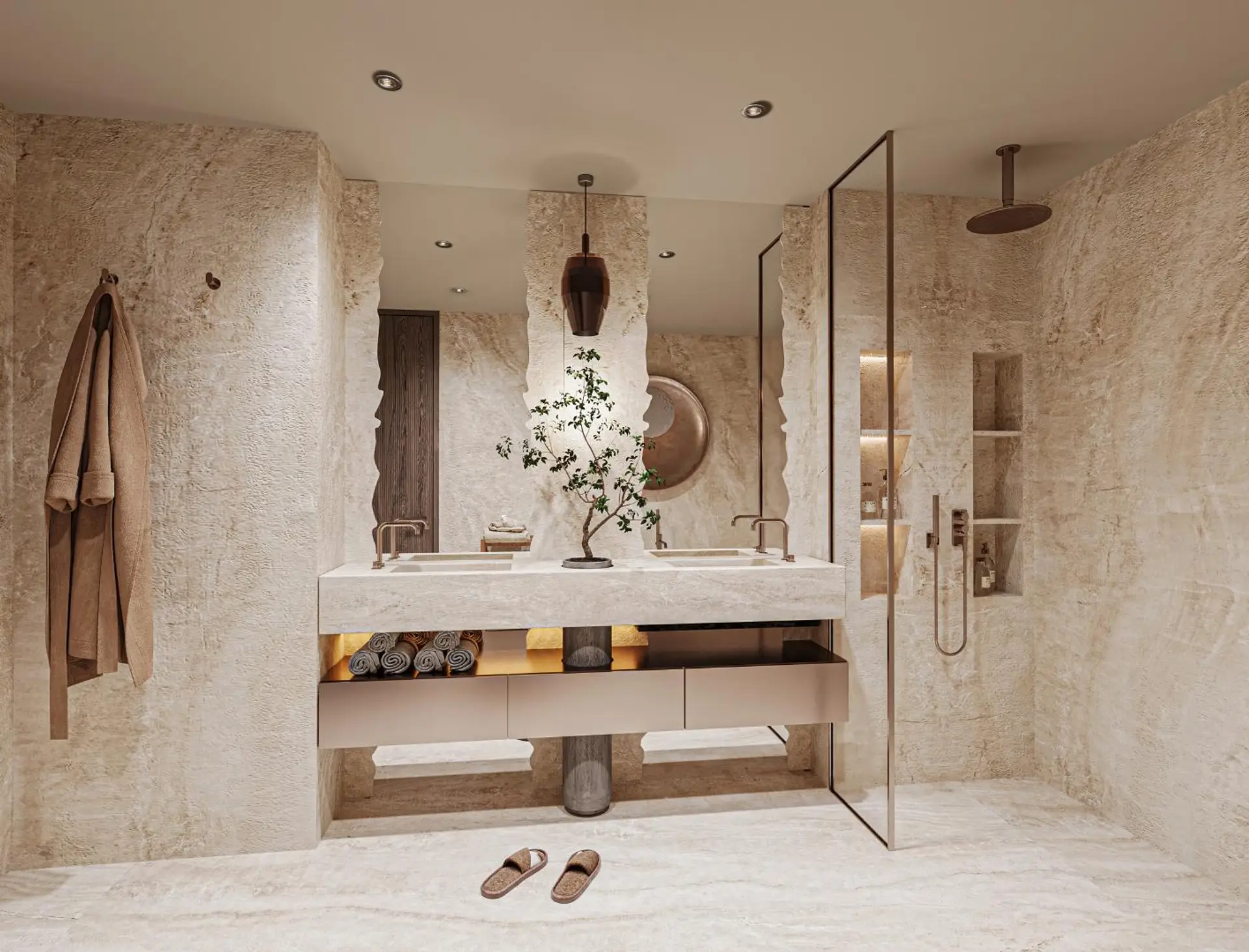 Zwei elegant ausgestattete Badezimmer – eines mit Badewanne, eines mit Dusche – sowie ein separates WC ergänzen das harmonische Raumkonzept. Ein praktischer Abstellraum bietet zusätzlichen Platz für Haushaltsgeräte oder Vorräte.