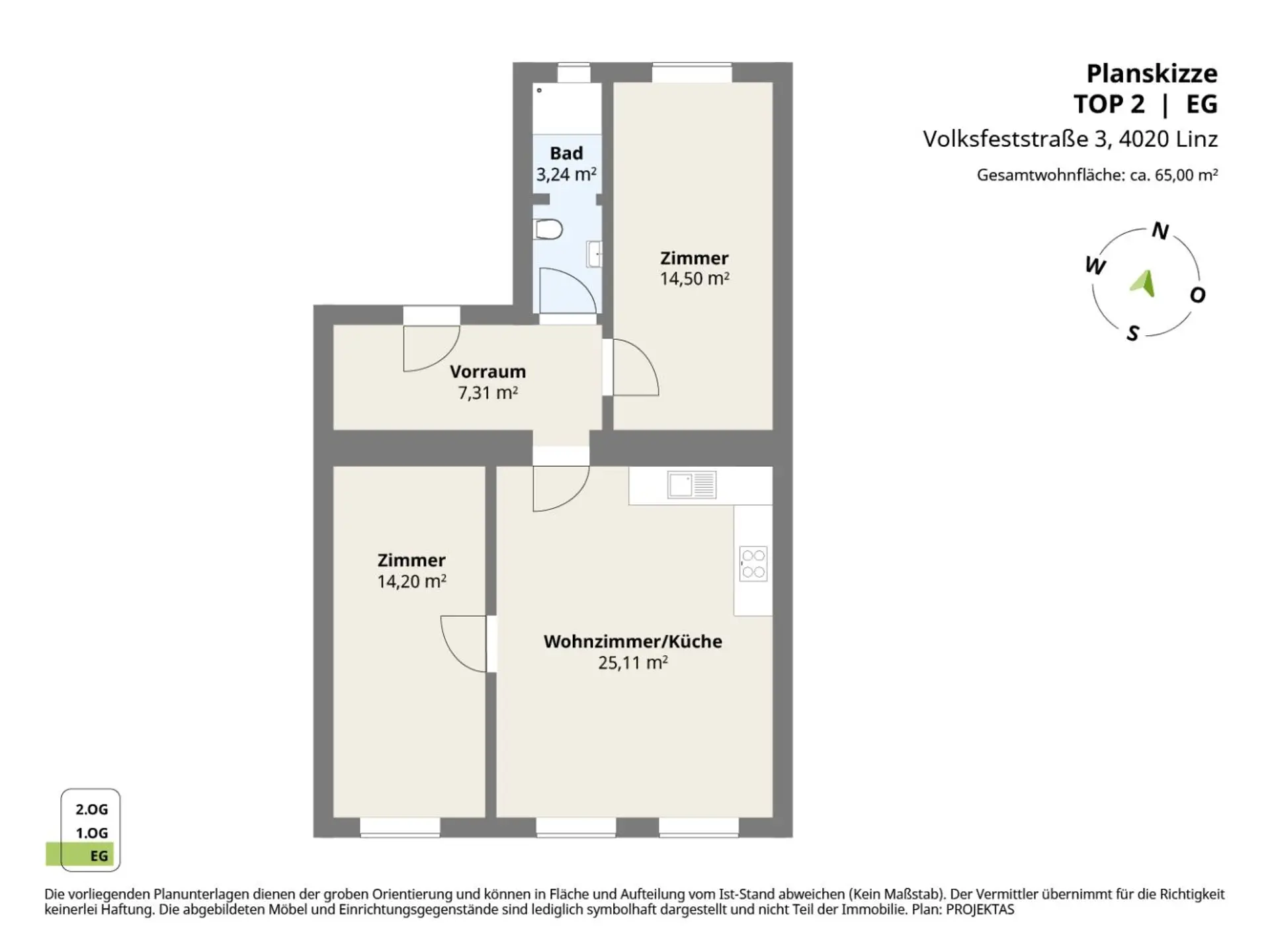 Raumaufteilung der Top 2 mit ca. 65 m² Wohnfläche: