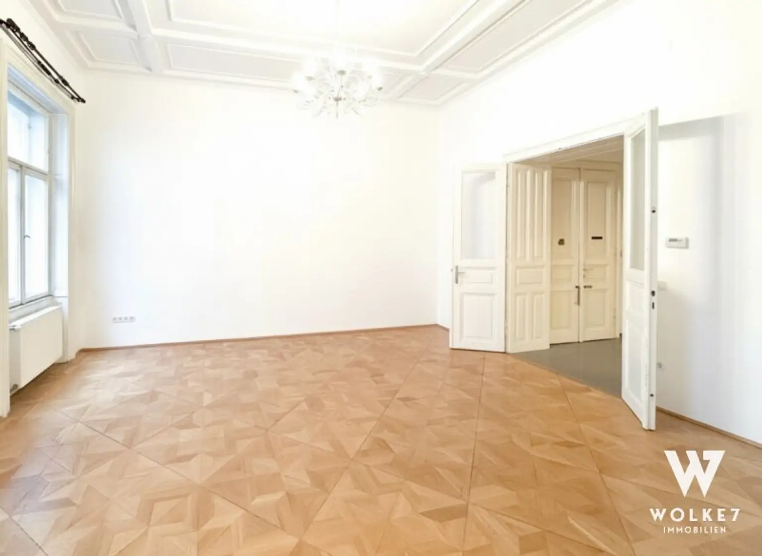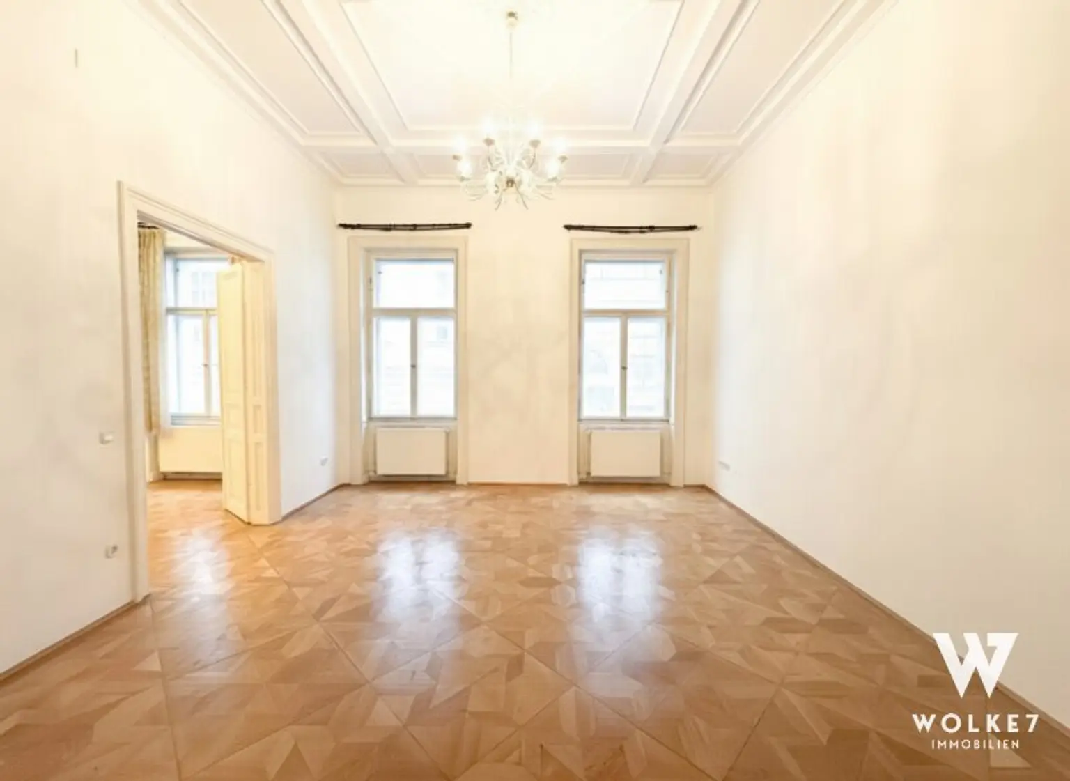Bereits beim Betreten spürt man den Charakter dieser Wohnung: Raumhöhen von ca. 3,80 Metern, originales Parkett aus dem 20. Jahrhundert, klassische Flügeltüren sowie doppelflügelige Kastenfenster verleihen den Räumen Großzügigkeit und Eleganz. Alle Zimmer sind zentral vom Vorraum aus begehbar – ein klarer, funktionaler Grundriss ohne Durchgangszimmer. Die Wohnküche liegt ruhig hofseitig und bietet direkten Zugang zur Terrasse – ein geschützter Außenbereich mitten in der Stadt, ideal für entspannte Abende oder ein Frühstück im Freien. Die Küche ist geschickt im hinteren Teil des Raumes integriert und optisch vom Ess- und Wohnbereich getrennt.