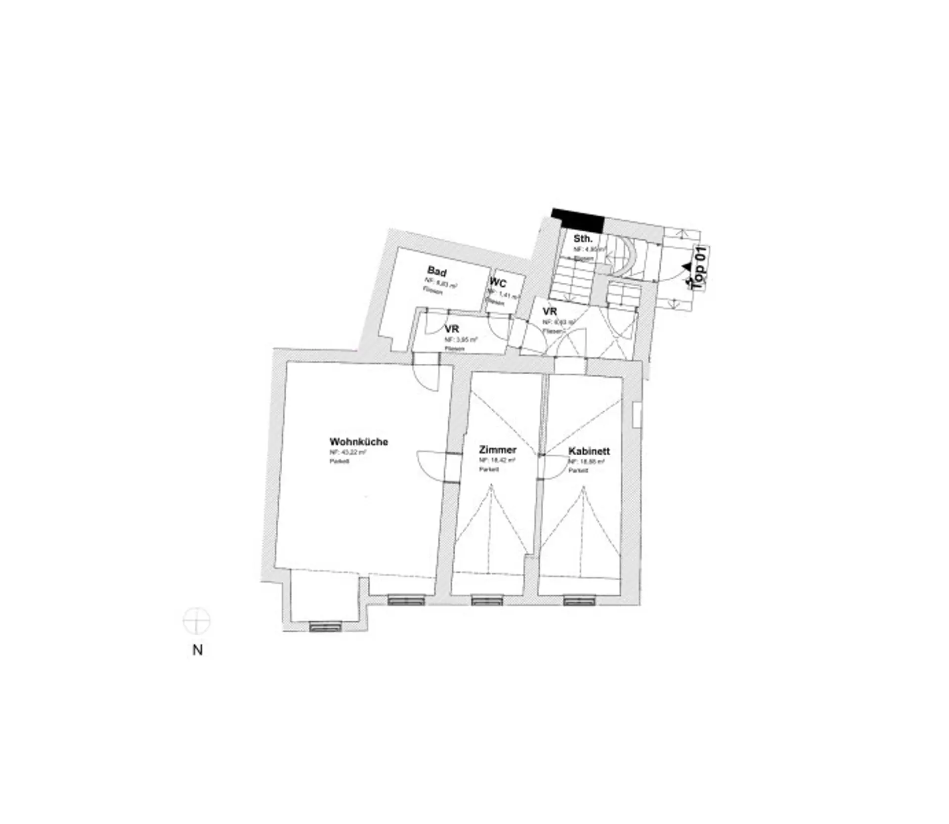 Die durchdachte Raumaufteilung ist bereits beim Betreten der Wohnung erkennbar: direkt beim Eingang befinden sich das Vorzimmer sowie WC und Bad. Die ca. 43 m² große Wohnküche lädt dazu ein, gemütliche und warme Abende im Familien- oder Freundeskreis zu verbringen.