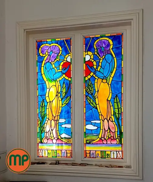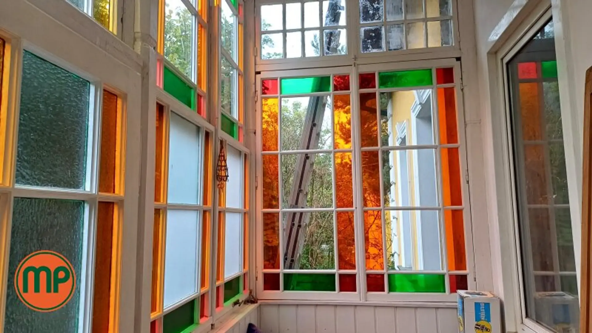 * Windfang mit bunten Fenstern im Eingangsbereich