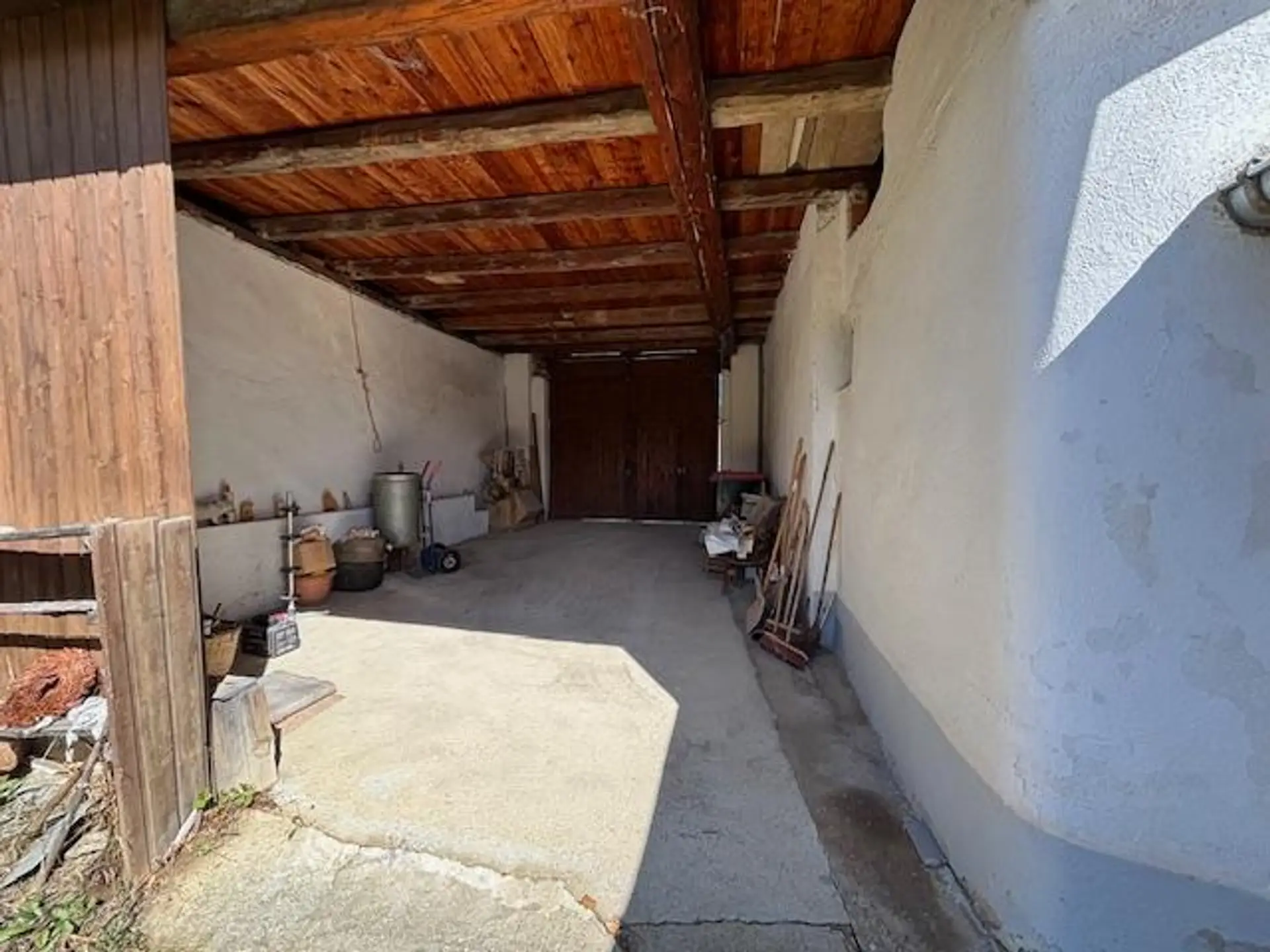 Durch die große Einfahrt (KFZ Stellplatz) gelangt man in den Innenhof, mit Zugang zu den diversen Nebengebäuden (Stallungen, Sommerküche), KG und dem Wohngebäude. Dieses betritt man durch einen kleinen Vorraum. Man gelangt von diesem in die Abstellkammer, KG, Innenhof und die zentral gelegene Küche. Beheizt wird das Objekt mit dem Holzofen in der Küche, welche die Radiatoren in den Zimmern