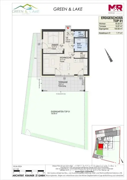 Die Wohnung Top 1 im Erdgeschoss bietet auf rund 50 m² Wohnfläche ein kompaktes, durchdachtes Raumkonzept, das mit offener Wohnküche, einem großzügigen Schlafzimmer sowie Bad und separatem WC höchsten Wohnkomfort verspricht.
