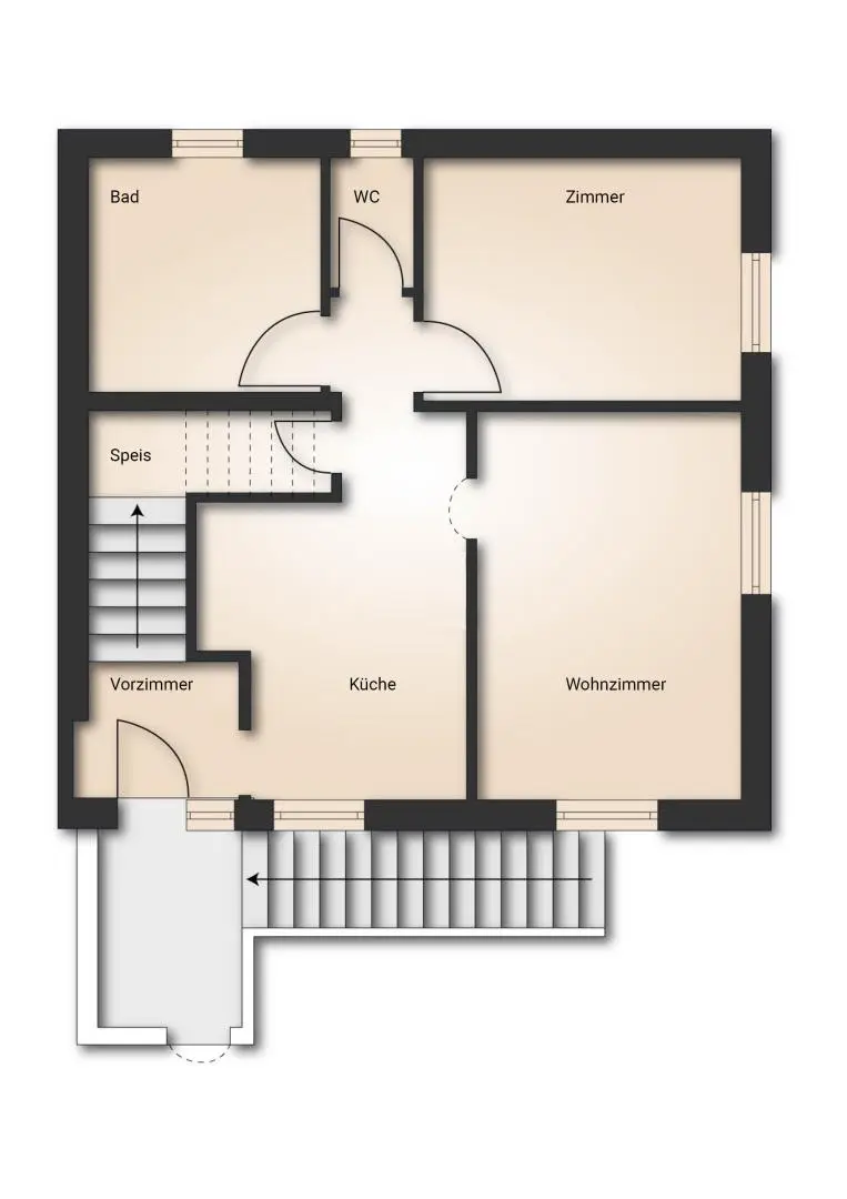 * Erdgeschoß ca. 54m²: Vorzimmer, Küche, Wohnzimmer, Zimmer, WC, Bad
