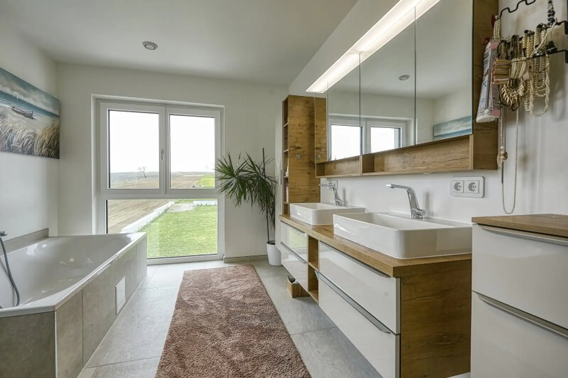 * ein elegantes Badezimmer mit großzügiger Doppelbadewanne und Panoramablick auf die traumhaften Weinberge