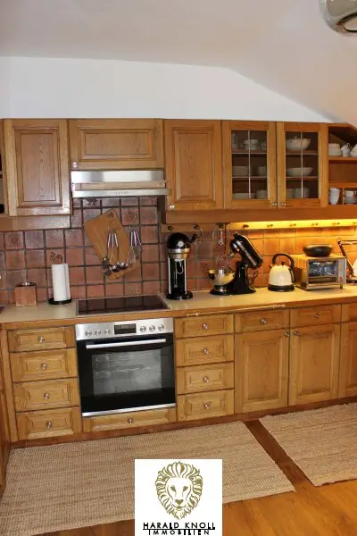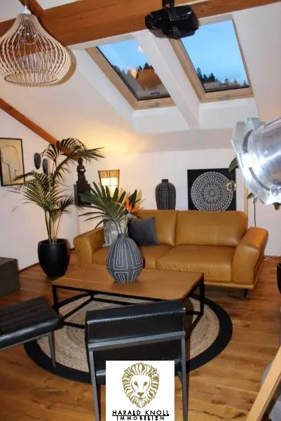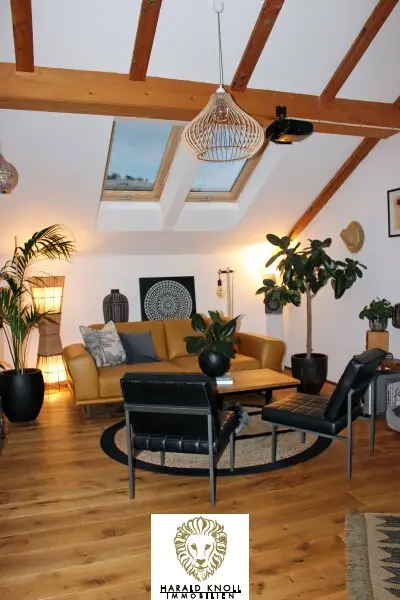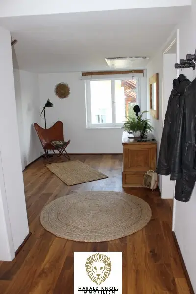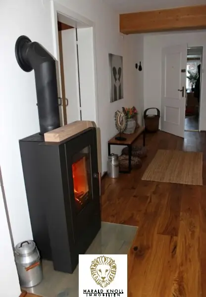 * 2017: Edles Eichenparkett (Schlossdiele) im Dachgeschoß, zwei große Dachfenster im offenen Wohnzimmer, stilvoller Kaminofen Haas & Sohn